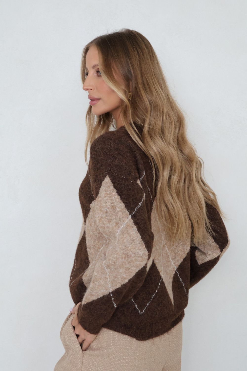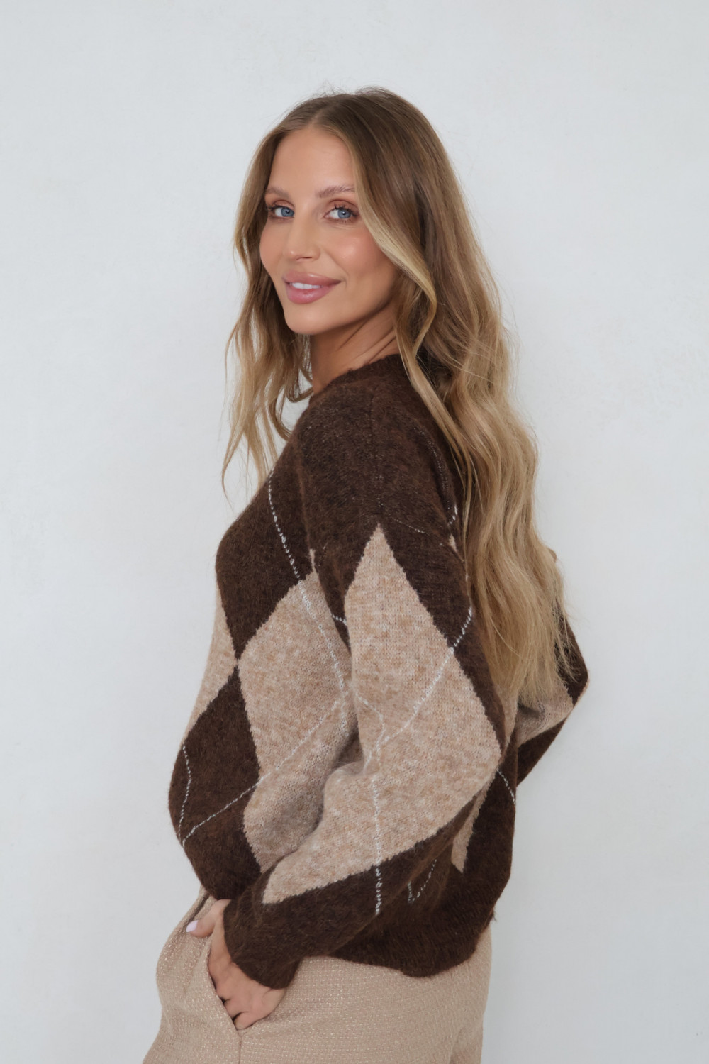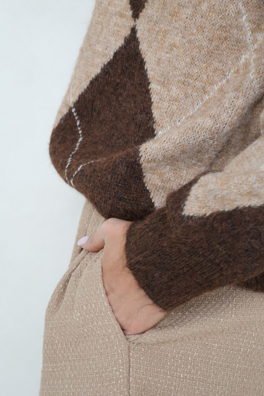 Sweter ROOMBY w romby wykonany jest z miękkiego, przyjemnego w dotyku materiału, który zapewnia komfort noszenia przez cały dzień. Klasyczny fason i subtelny wzór w romby nadają mu ponadczasowy charakter, dzięki czemu sweter sprawdzi się zarówno w codziennych, jak i bardziej eleganckich stylizacjach.