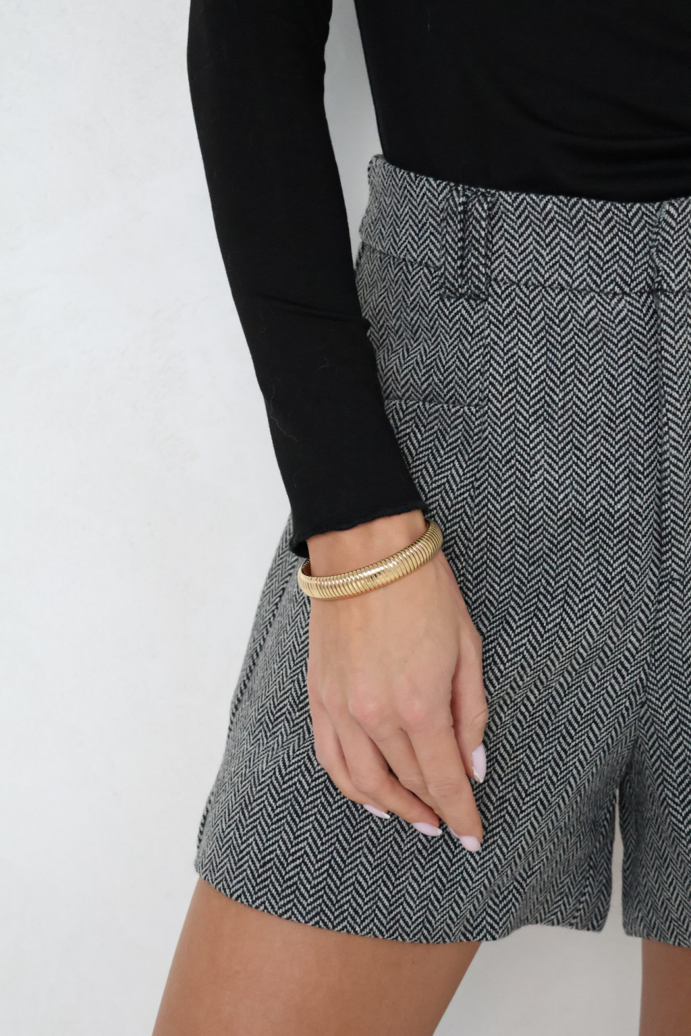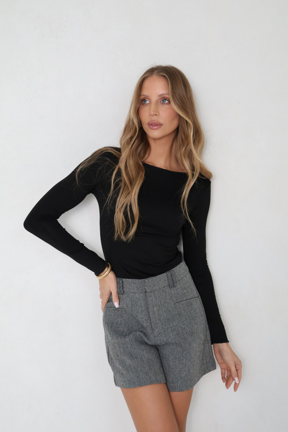 Szorty w jodełkę ARIANE z wysokim stanem wykonane są z miękkiego i przyjemnego w dotyku materiału, który dopasowuje się do sylwetki i podkreśla talię. Wysoki stan i subtelny szary wzór w jodełkę nadają modelowi elegancki charakter, dzięki czemu szorty sprawdzą się zarówno w codziennych, jak i bardziej formalnych zestawieniach.