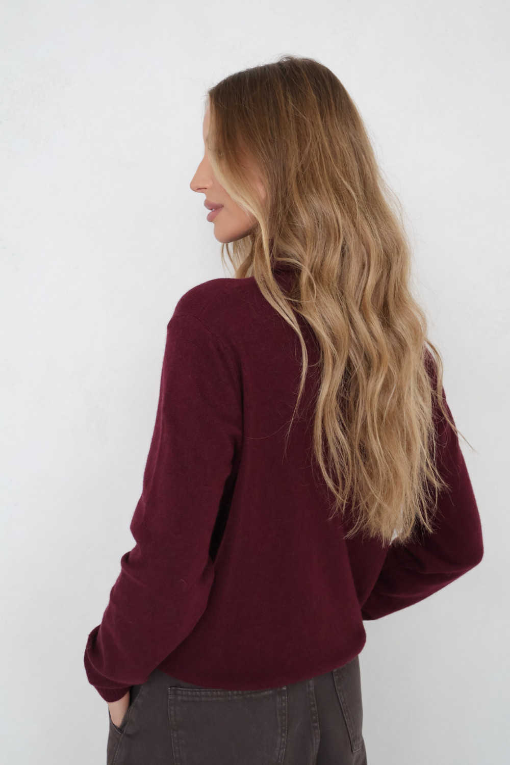 Golf VEIL w kolorze śliwki wykonany jest z wysokiej jakości mieszanki wełny i kaszmiru, co zapewnia miękkość, naturalne ciepło i przyjemną fakturę materiału. Lekki i jednocześnie izolujący, model subtelnie otula sylwetkę, tworząc elegancki, klasyczny efekt.