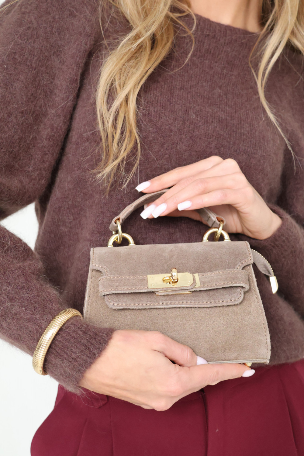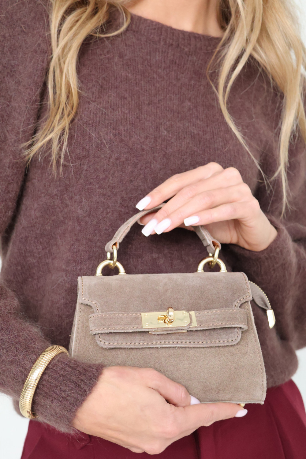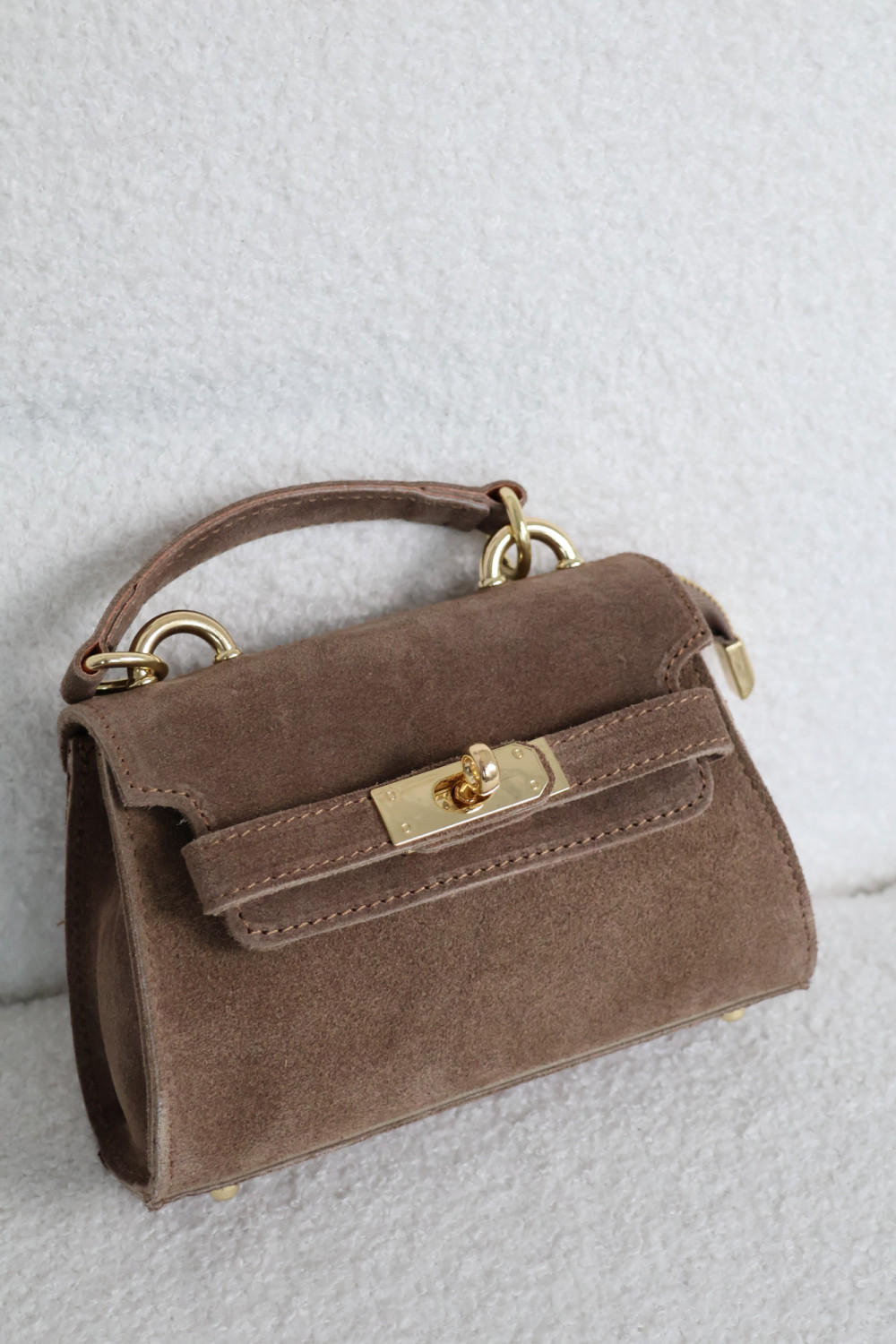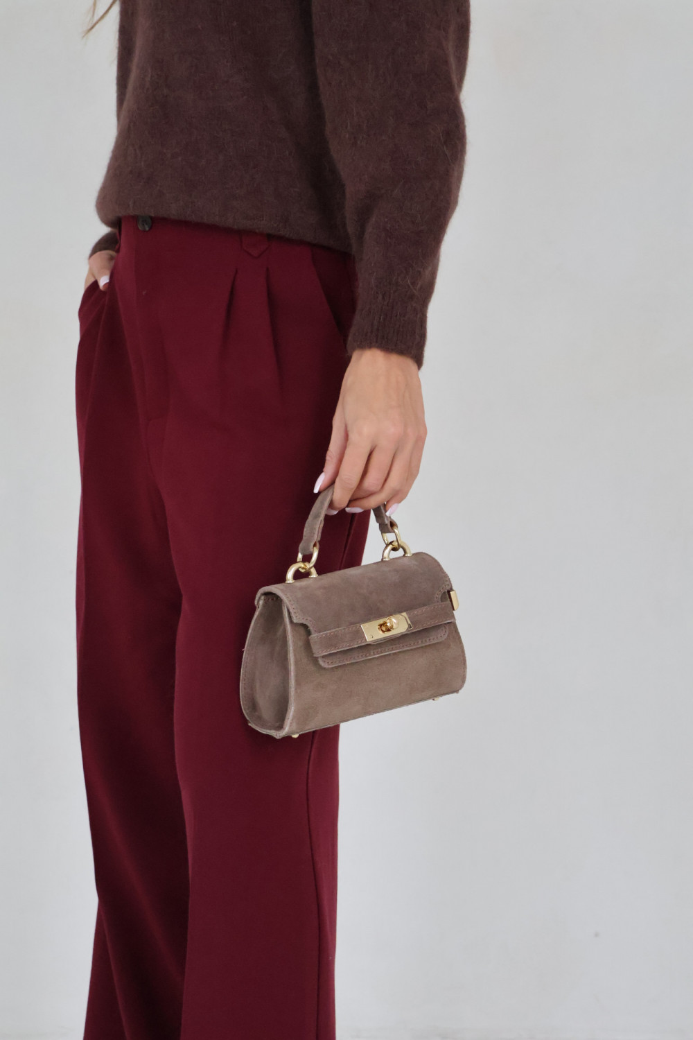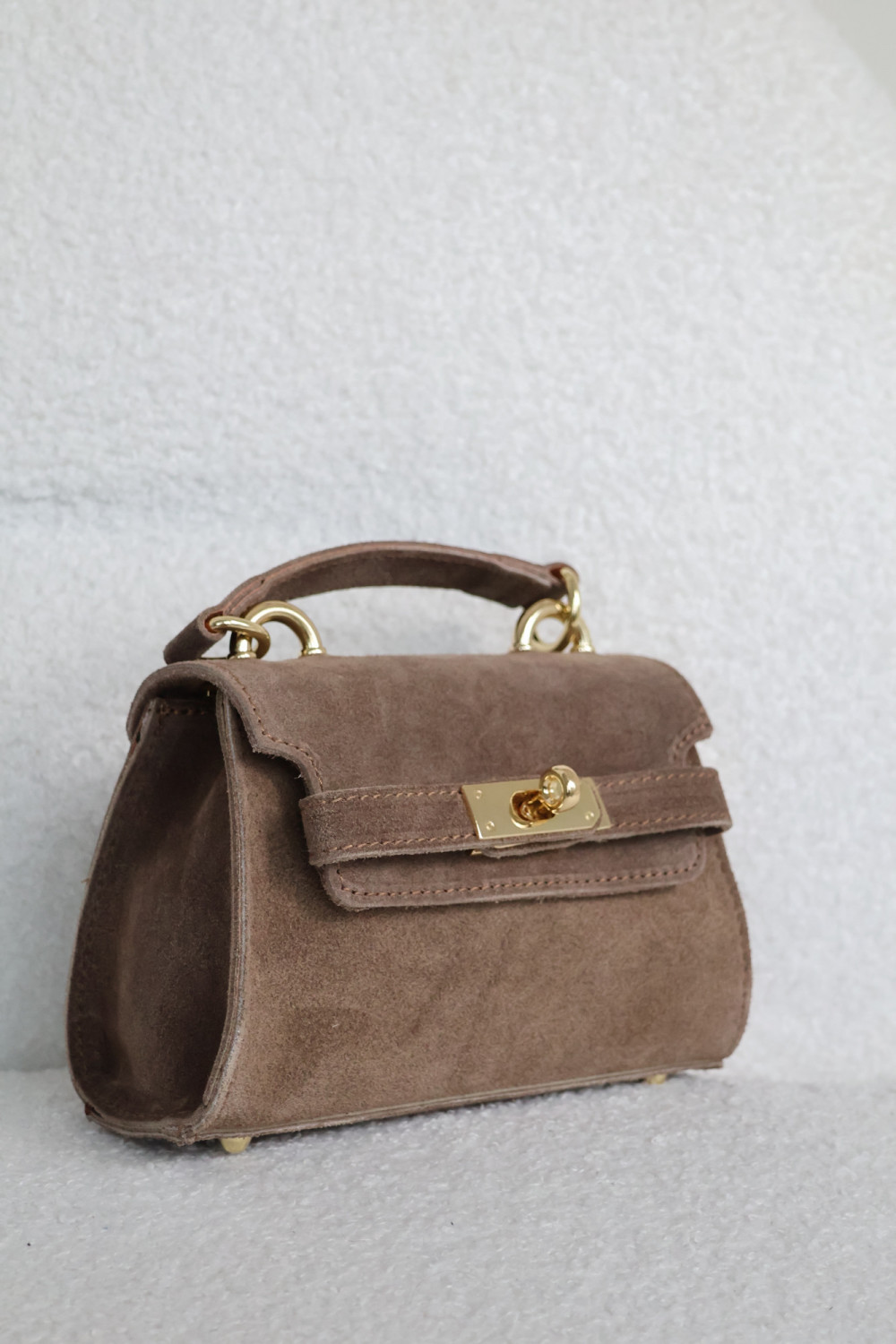 Torebka mini TIFFANY wykonana jest w 100% z naturalnej skóry zamszowej. Klasyczny fason w kompaktowym rozmiarze sprawia, że model sprawdzi się zarówno na co dzień, jak i przy bardziej eleganckich stylizacjach. Odcień taupe jest stonowany i uniwersalny, dzięki czemu łatwo zestawić go z różnymi kolorami ubrań.