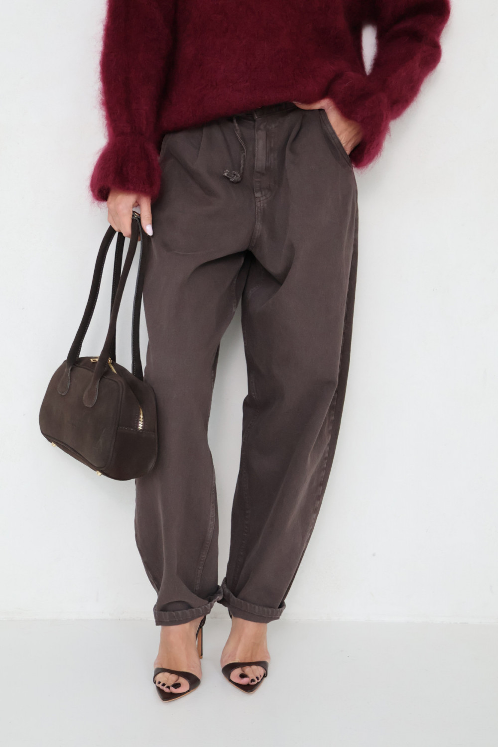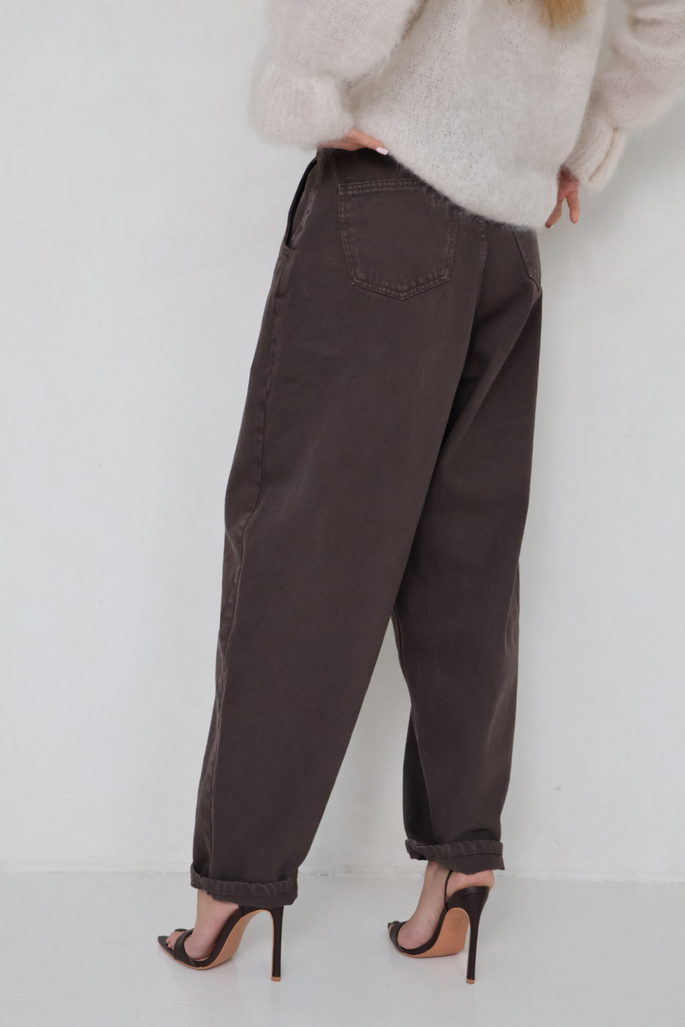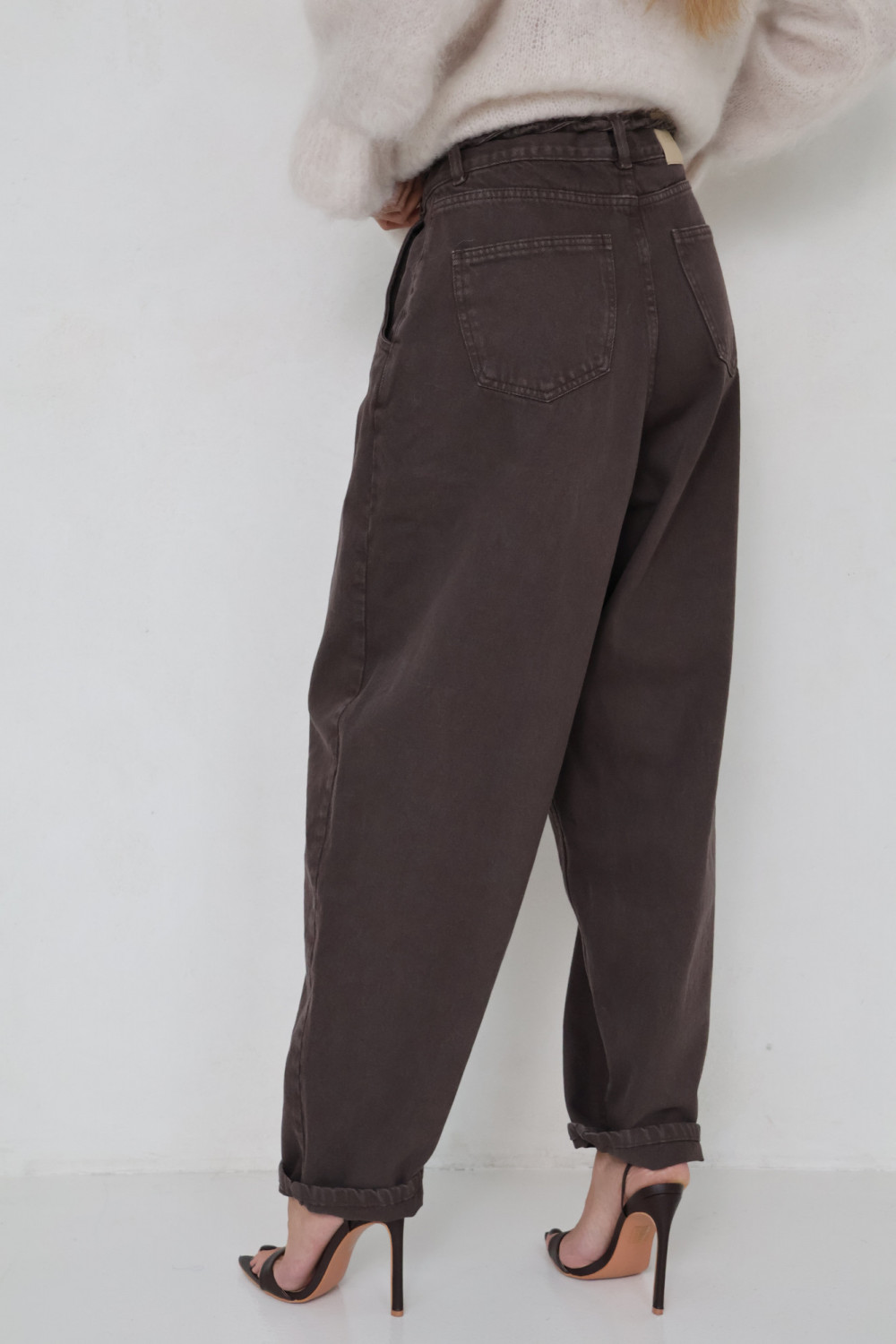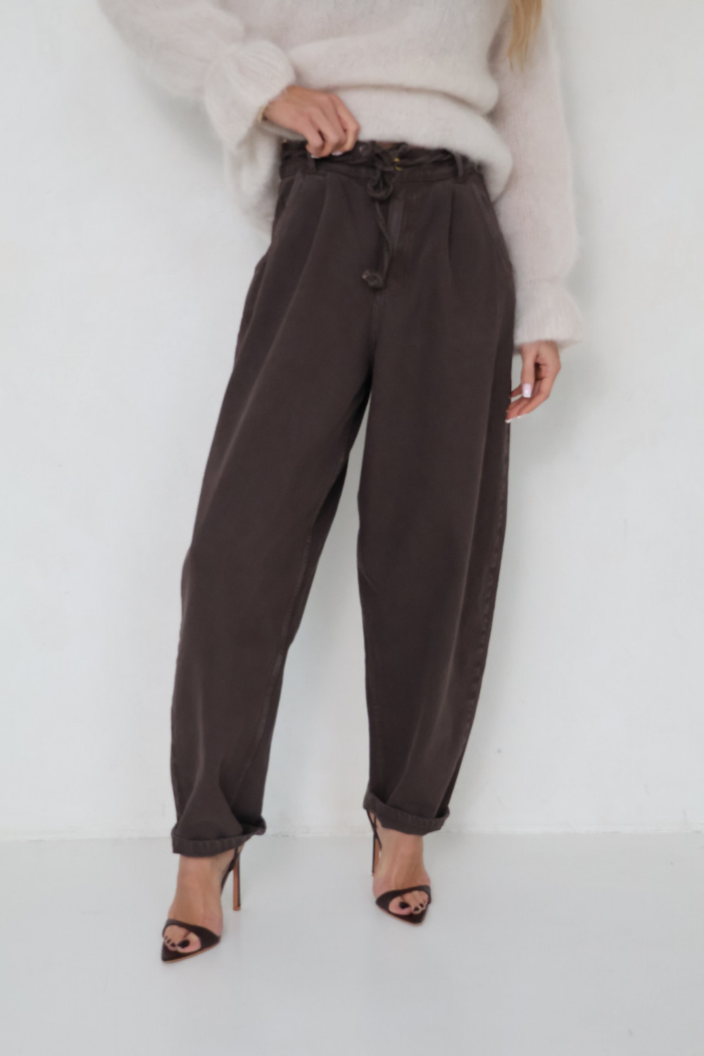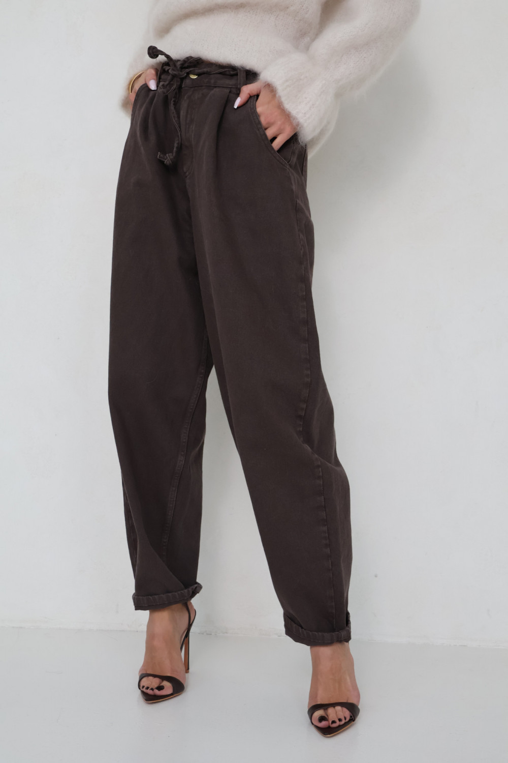 Spodnie JACKIE w czekoladowym kolorze wykonane są z wysokiej jakości materiału, który zapewnia komfort noszenia i lekkość w ruchu. Fason balonowy nadaje sylwetce subtelnej objętości, a wysoki stan podkreśla talię, tworząc modny i swobodny efekt.