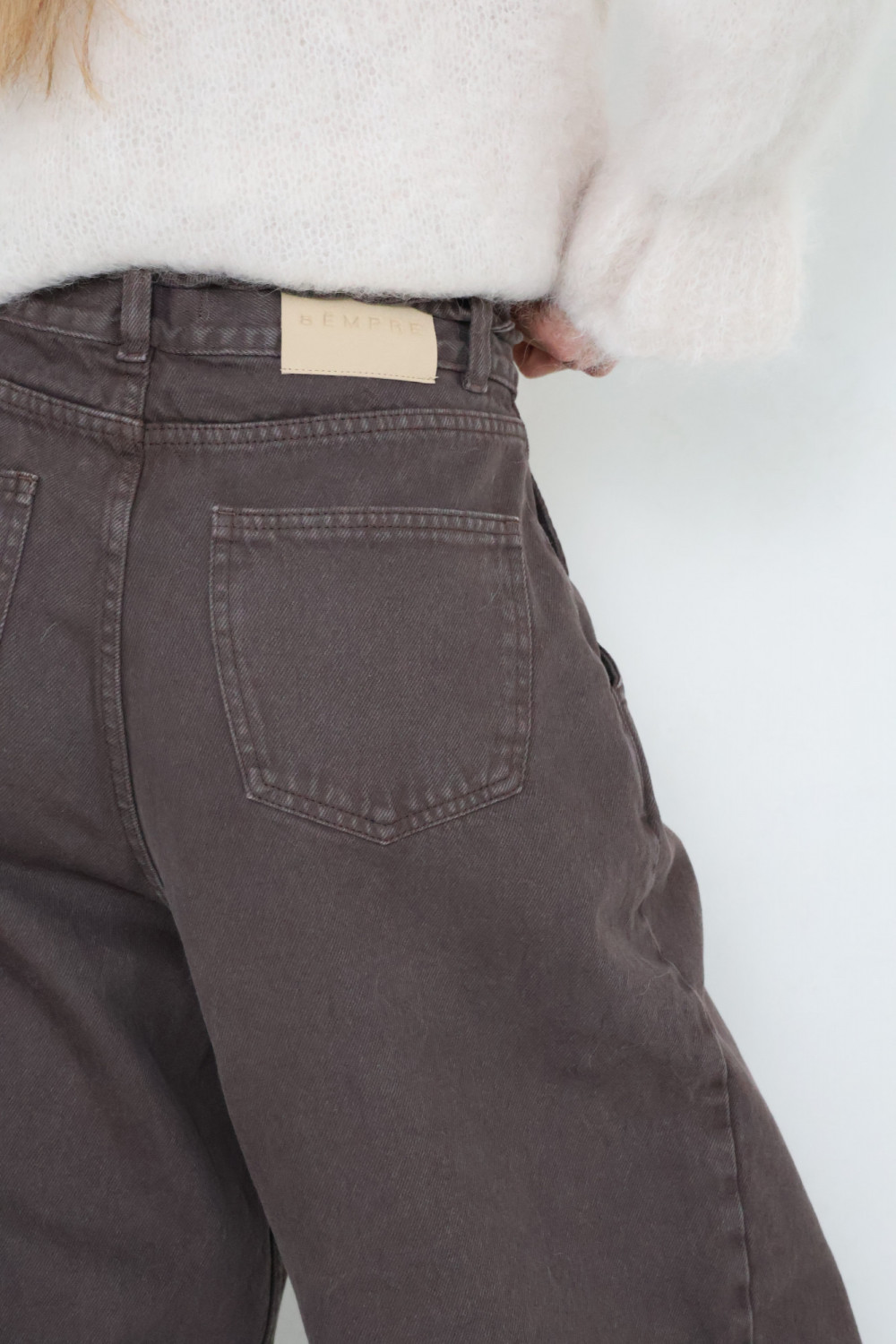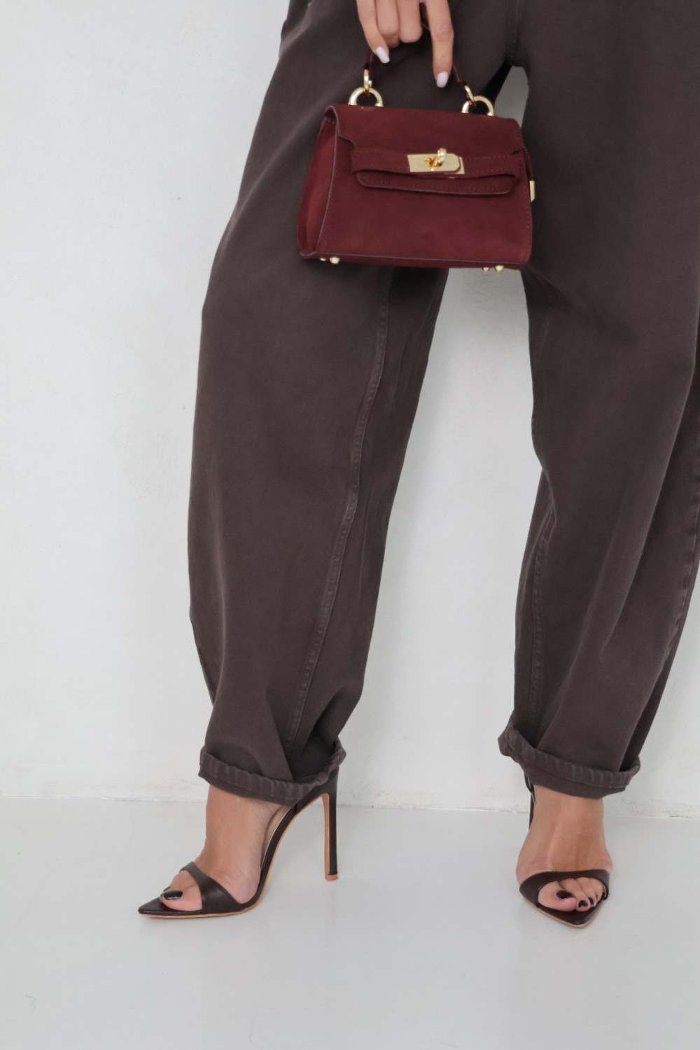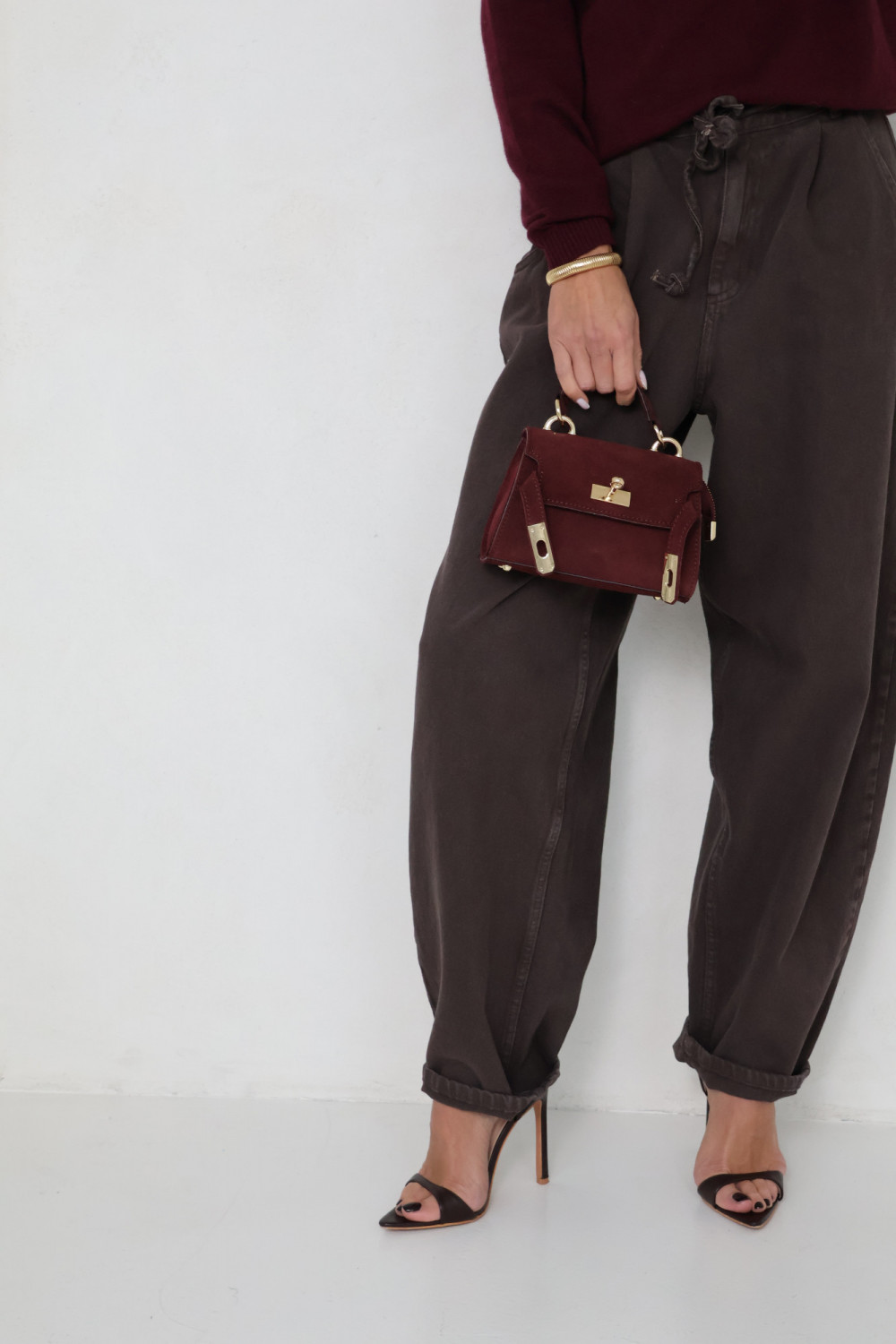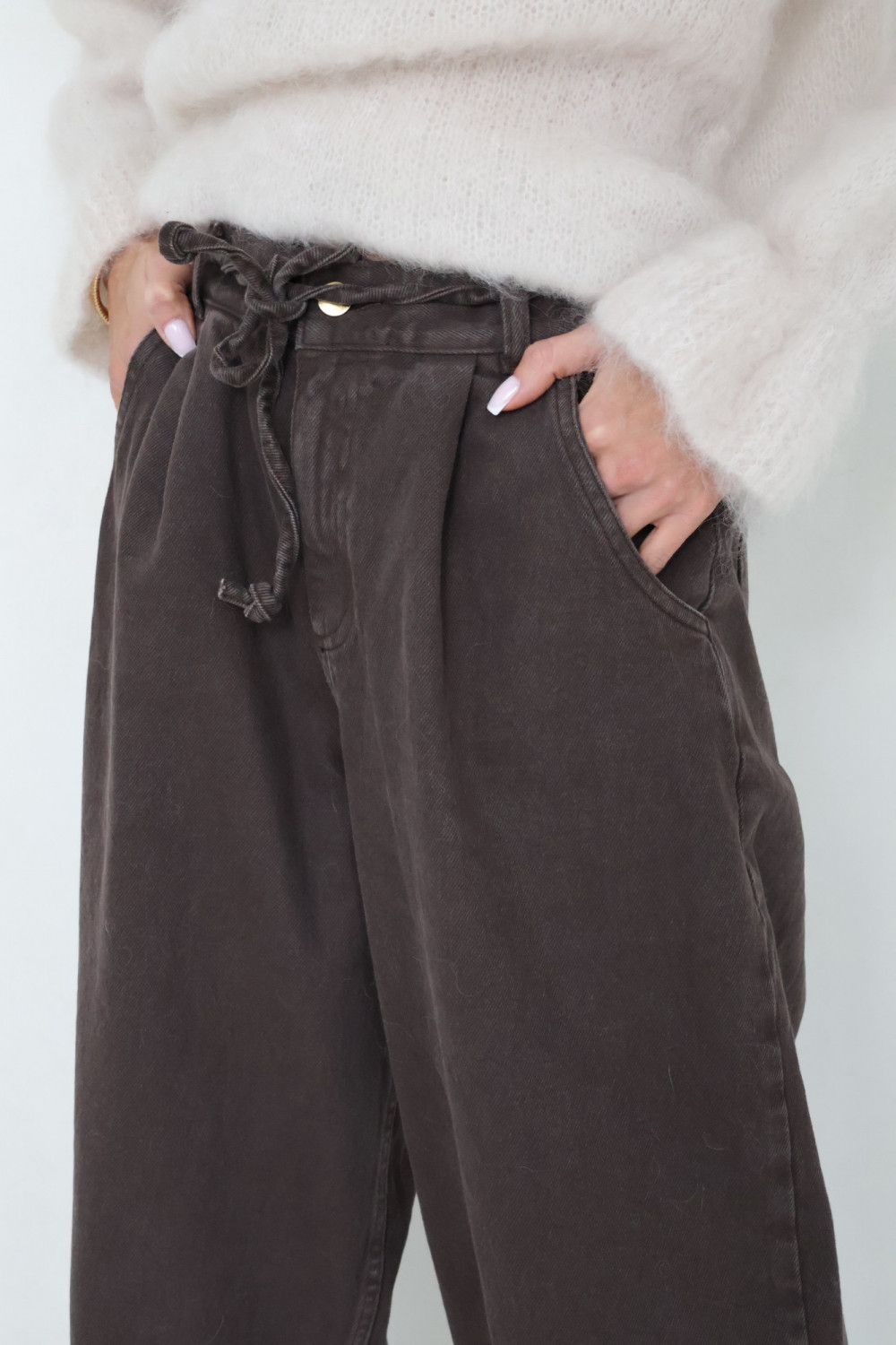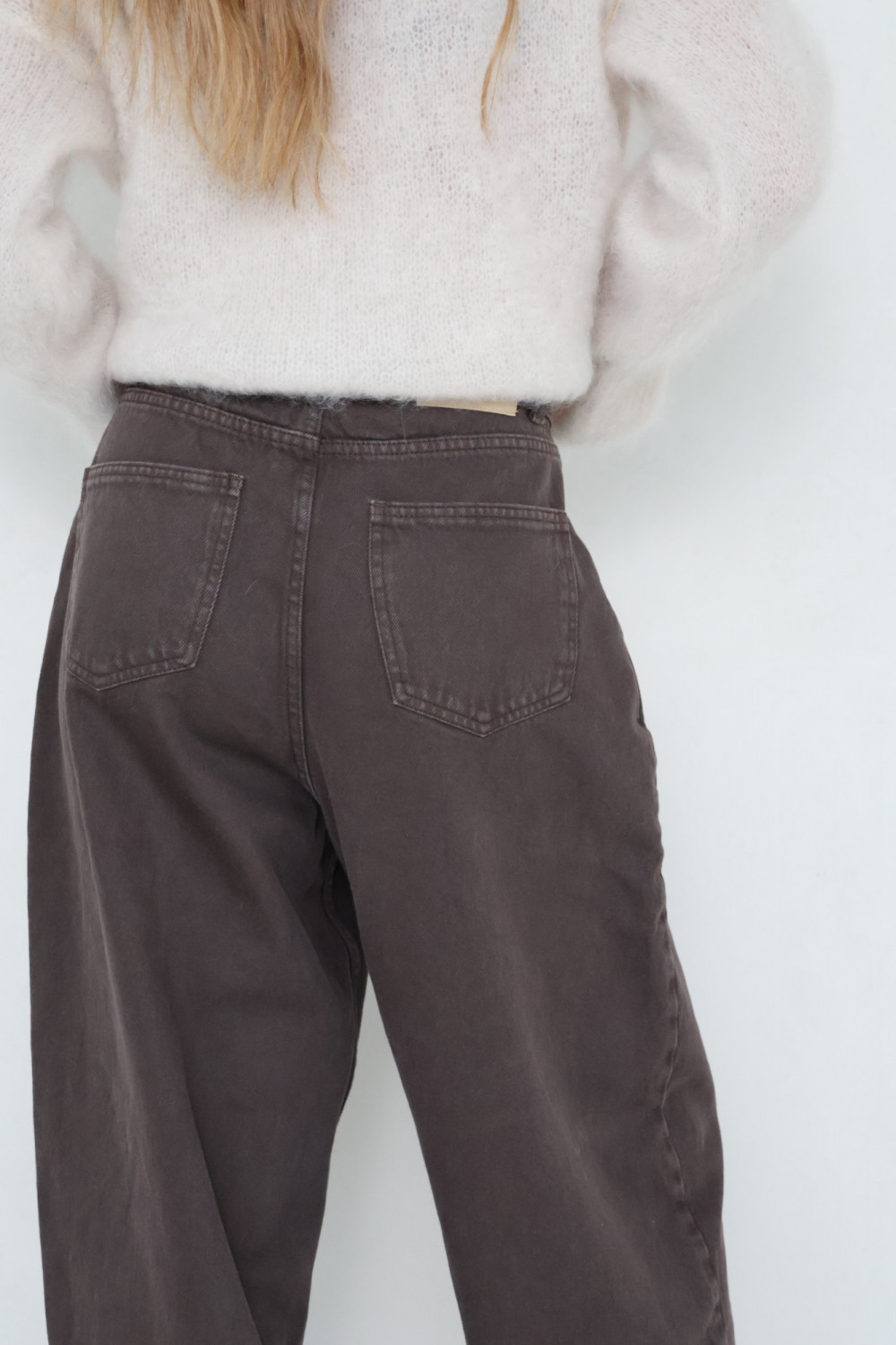 Spodnie JACKIE w czekoladowym kolorze wykonane są z wysokiej jakości materiału, który zapewnia komfort noszenia i lekkość w ruchu. Fason balonowy nadaje sylwetce subtelnej objętości, a wysoki stan podkreśla talię, tworząc modny i swobodny efekt.