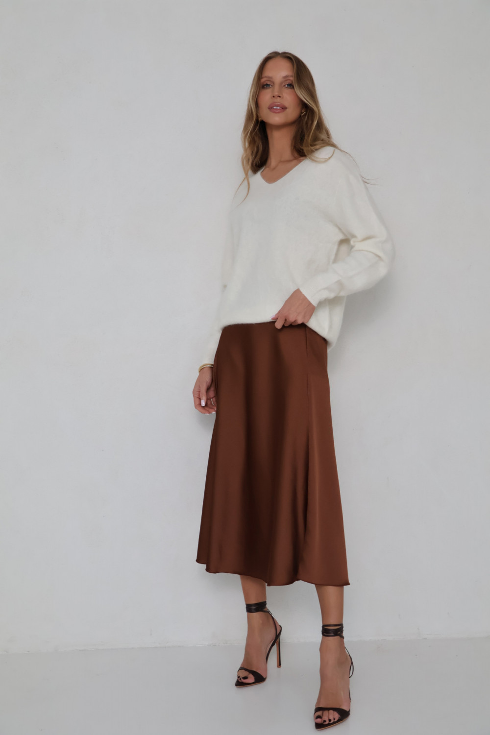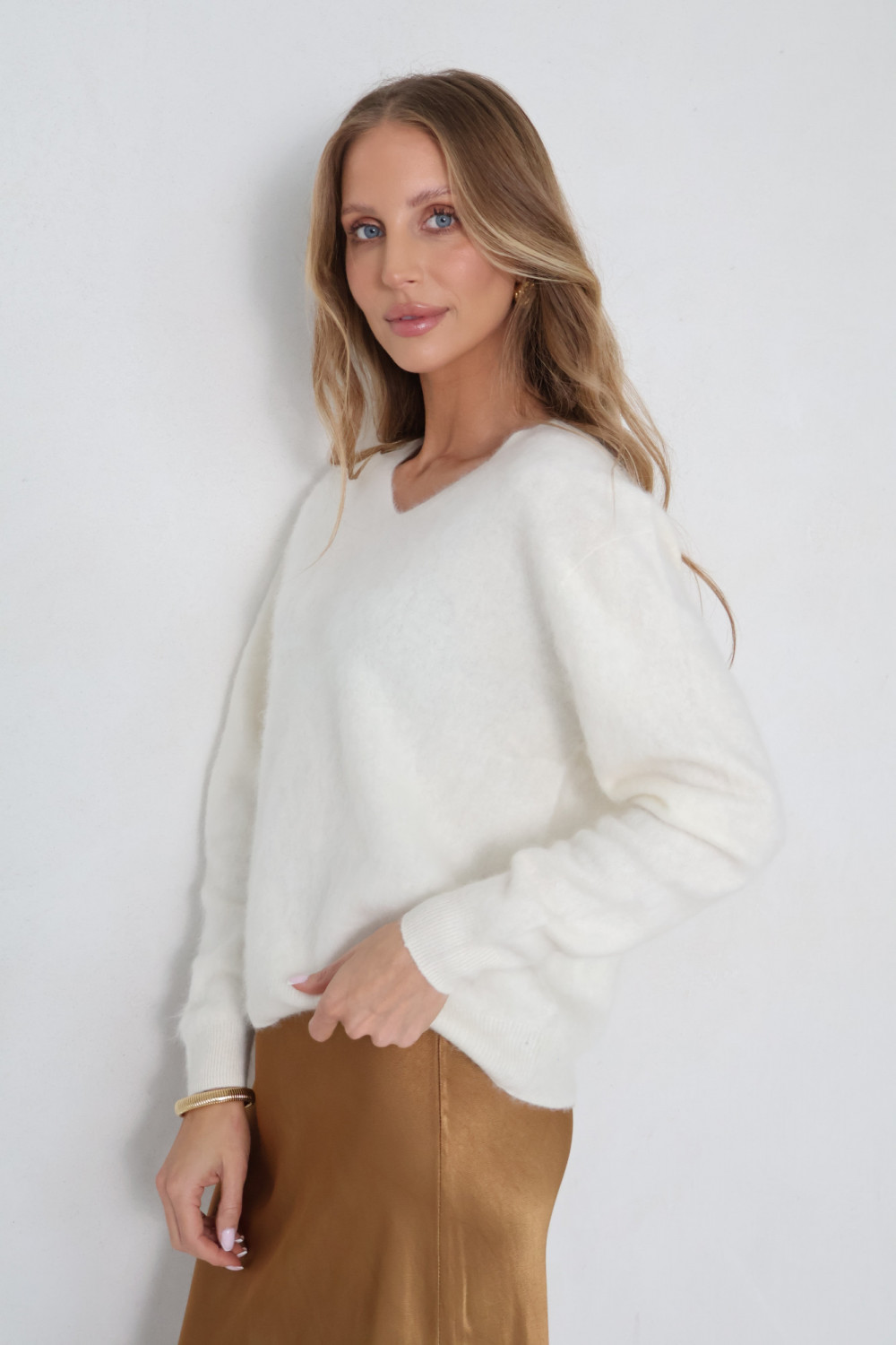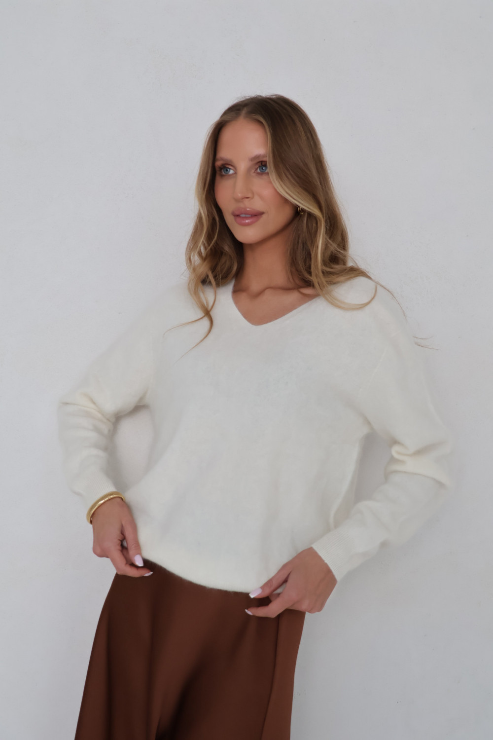 Dekolt w serek nadaje swetrowi lekkość i subtelną formę, a klasyczny krój sprawia, że model zachowuje ponadczasowy charakter. Śmietankowy kolor to neutralny, ciepły odcień, który łatwo zestawić z innymi elementami garderoby, od spodni po spódnice, pozwalając tworzyć spójne i estetyczne zestawy.