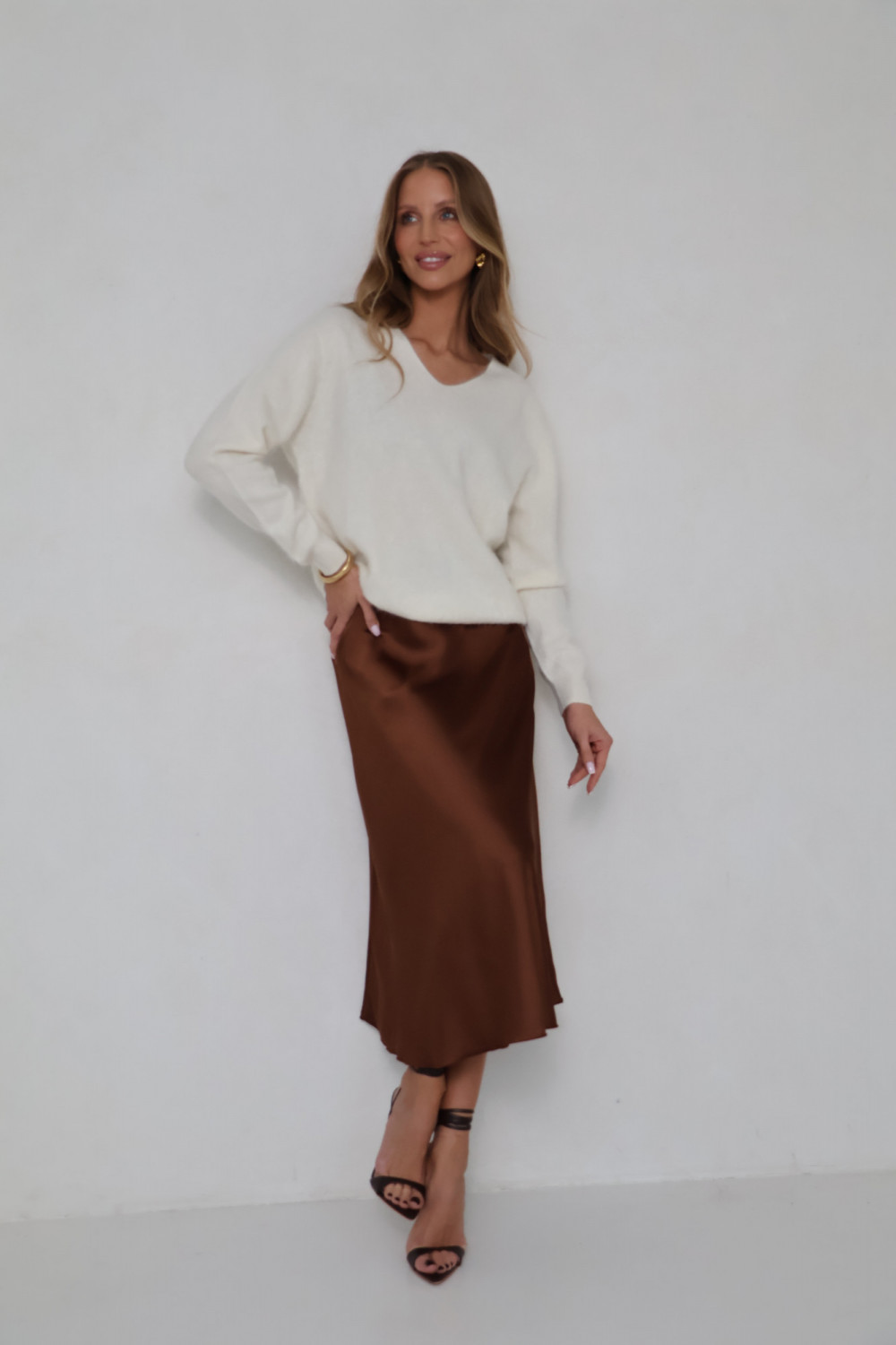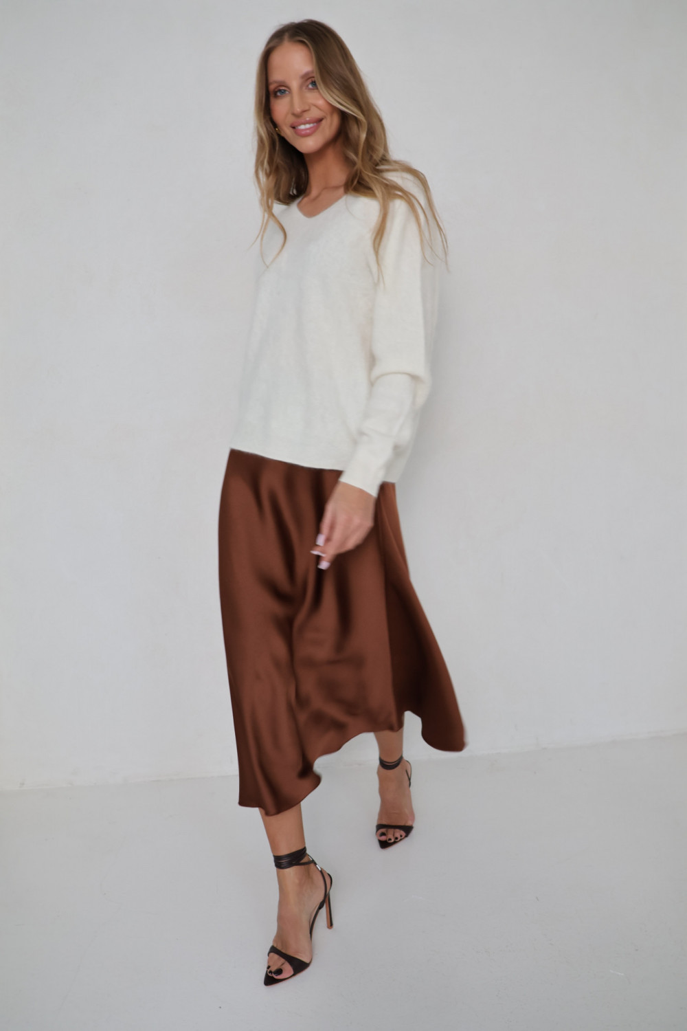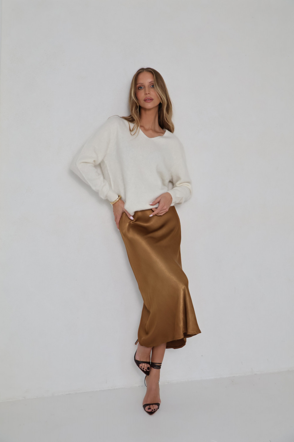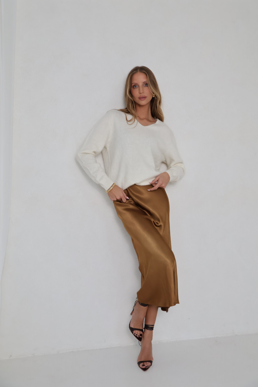 Dekolt w serek nadaje swetrowi lekkość i subtelną formę, a klasyczny krój sprawia, że model zachowuje ponadczasowy charakter. Śmietankowy kolor to neutralny, ciepły odcień, który łatwo zestawić z innymi elementami garderoby, od spodni po spódnice, pozwalając tworzyć spójne i estetyczne zestawy.