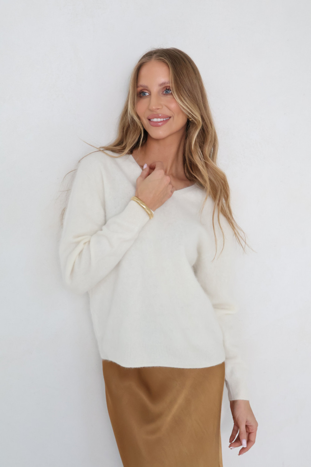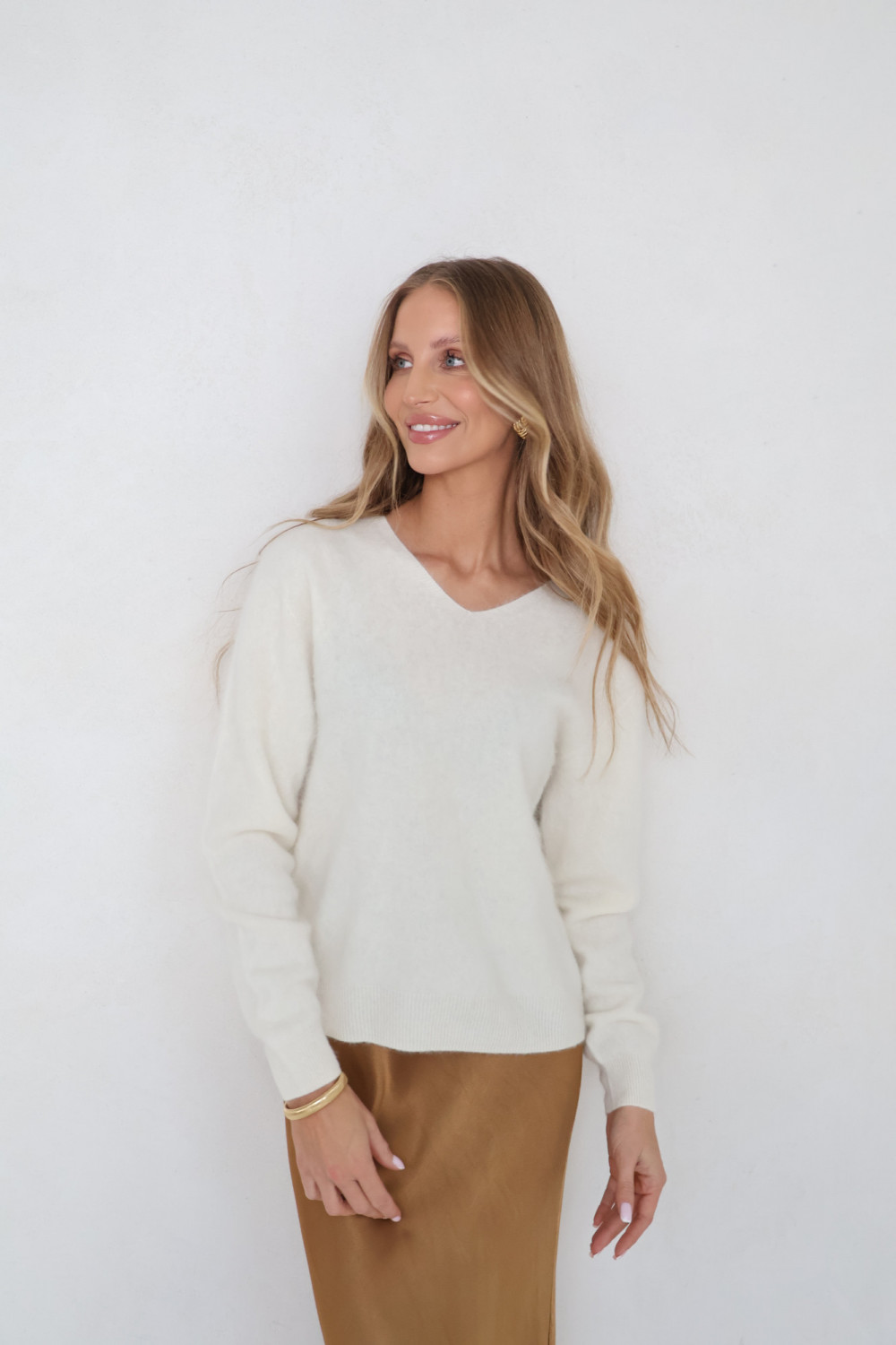 Sweter V z kaszmirem i wełną śmietanka CASHMERE