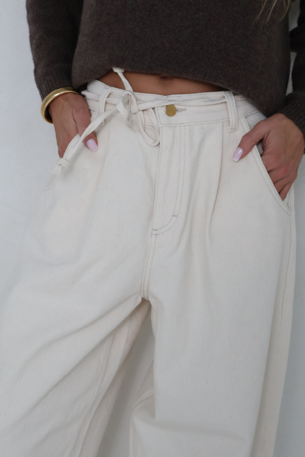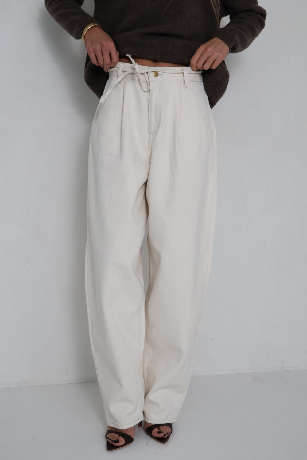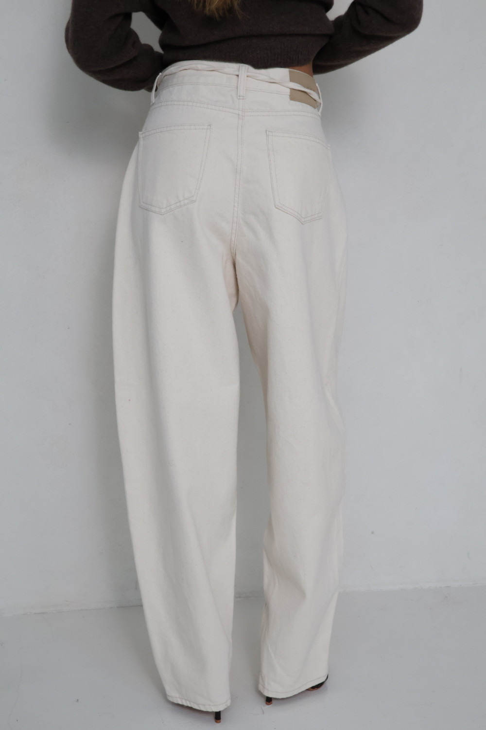 Spodnie JACKIE w kremowym kolorze wykonane są z wysokiej jakości materiału, który zapewnia komfort noszenia i lekką strukturę. Fason balonowy nadaje sylwetce subtelnej objętości, tworząc modny i swobodny efekt, a wysoki stan podkreśla talię.
