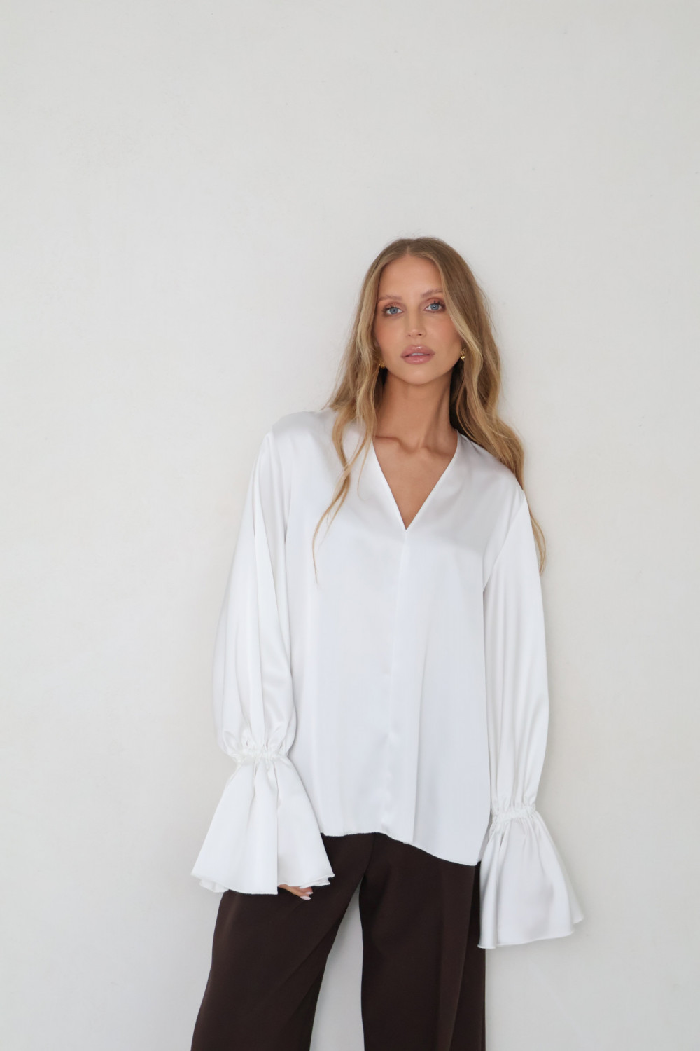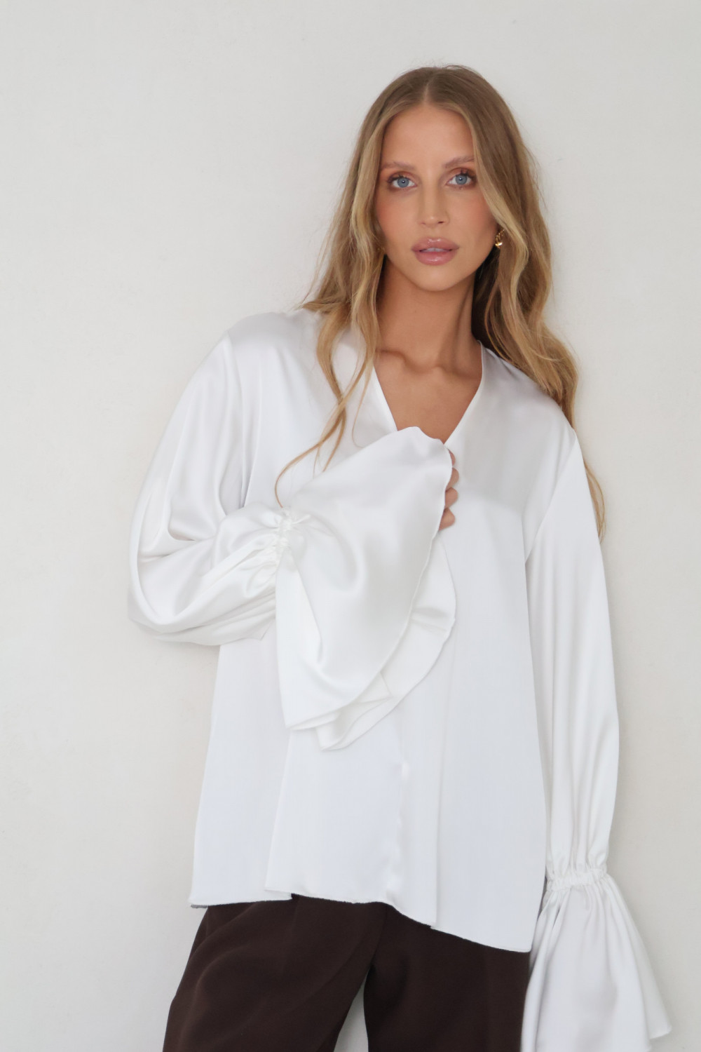 Koszula VIVIEN w kolorze śmietanki wykonana jest z lekkiego, miękkiego materiału, który zapewnia przyjemne uczucie w dotyku i naturalny komfort noszenia. Fason typu dzwonek nadaje koszuli subtelną formę, delikatnie rozszerzając rękawy i dodając lekkości sylwetce.