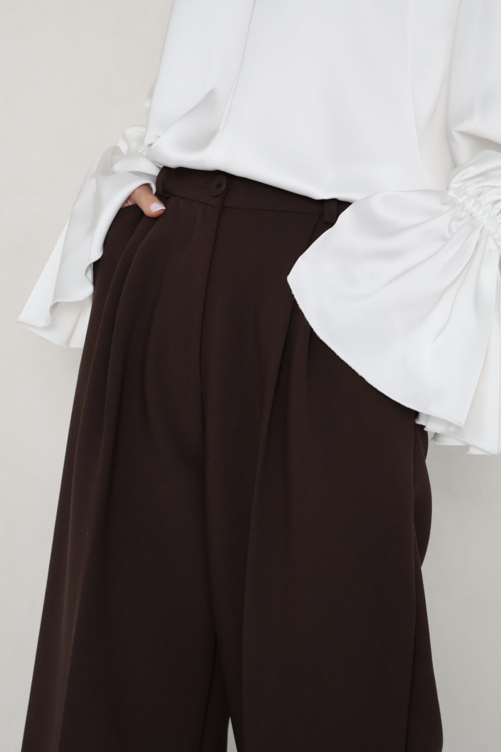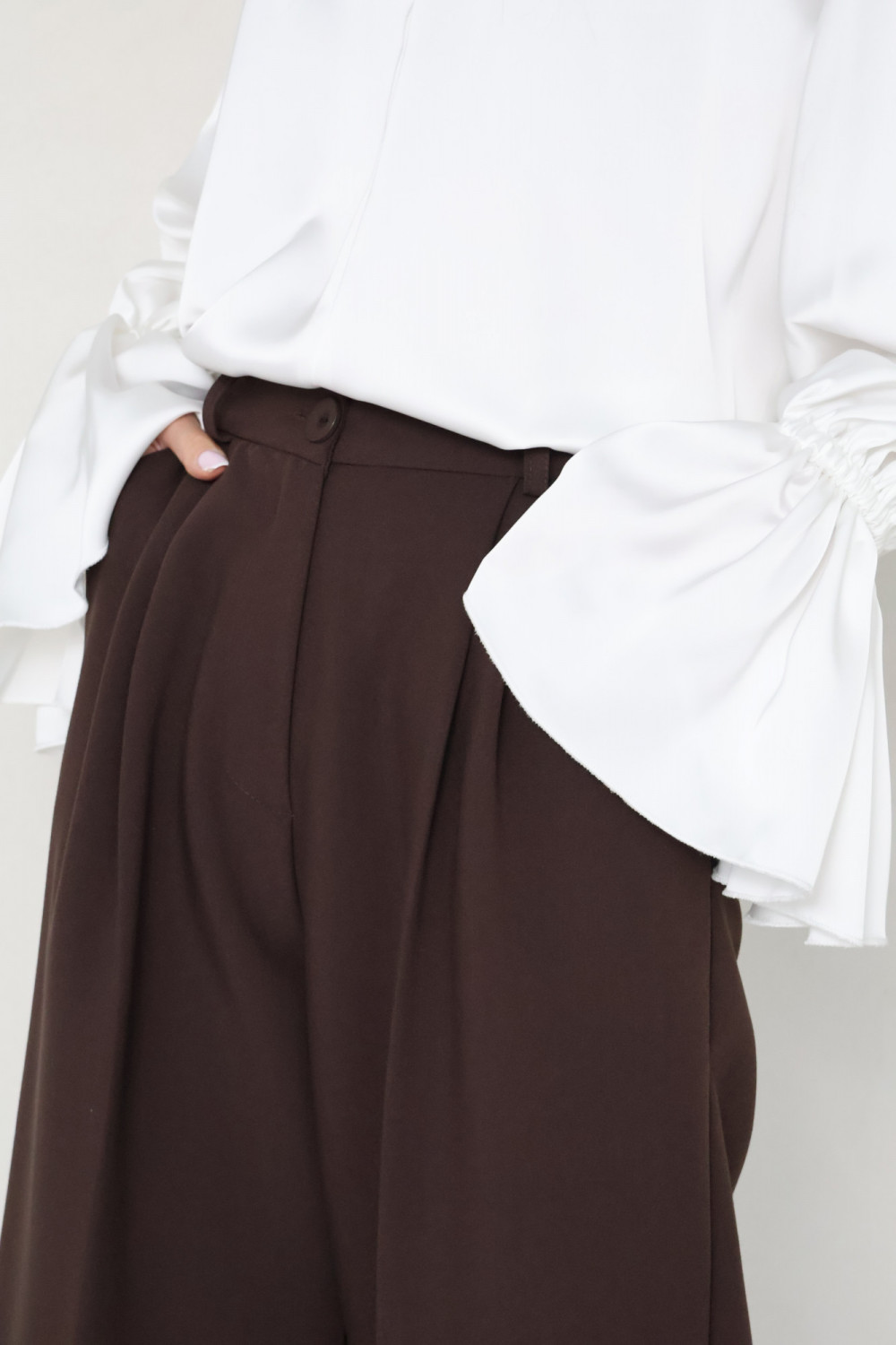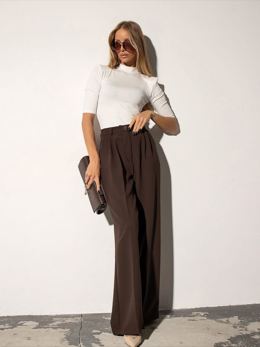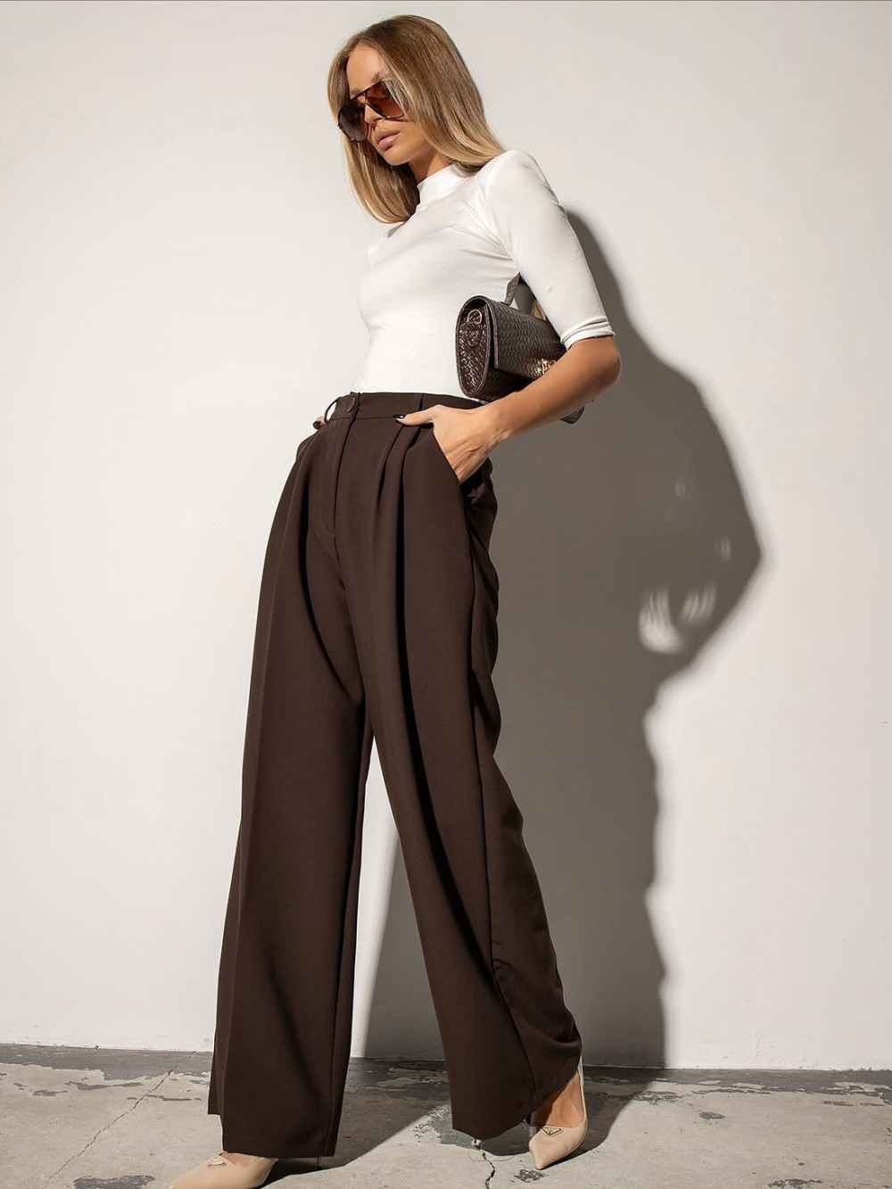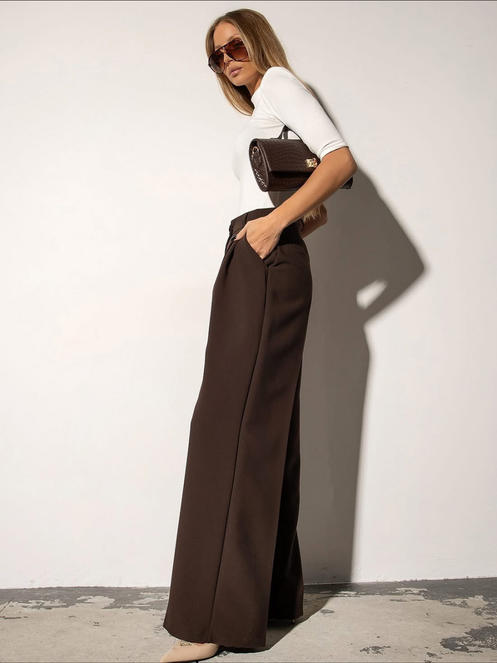 Spodnie STREETSTYLE w czekoladowym kolorze wykonane są z wysokiej jakości materiału, który zapewnia komfort noszenia przez cały dzień. Wysoki stan podkreśla talię, a rozszerzane nogawki nadają sylwetce lekkości i optycznie wydłużają nogi.