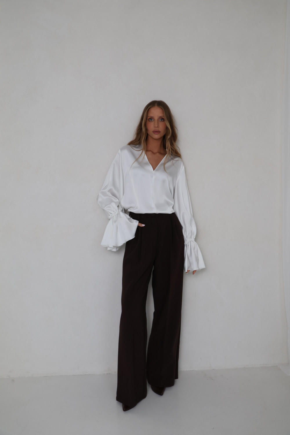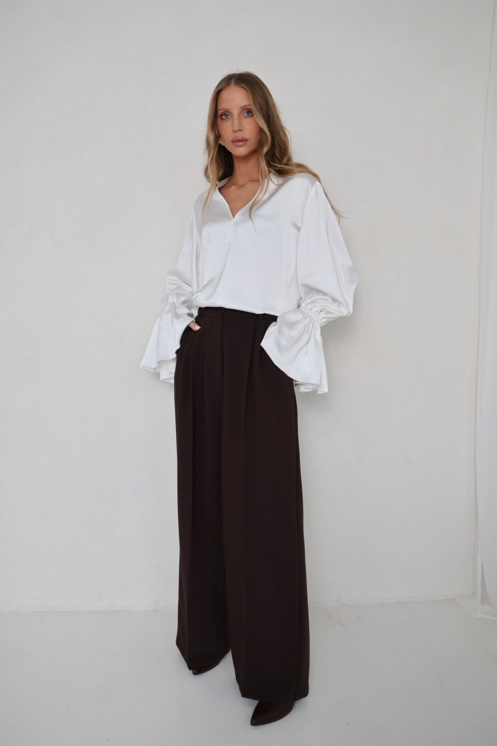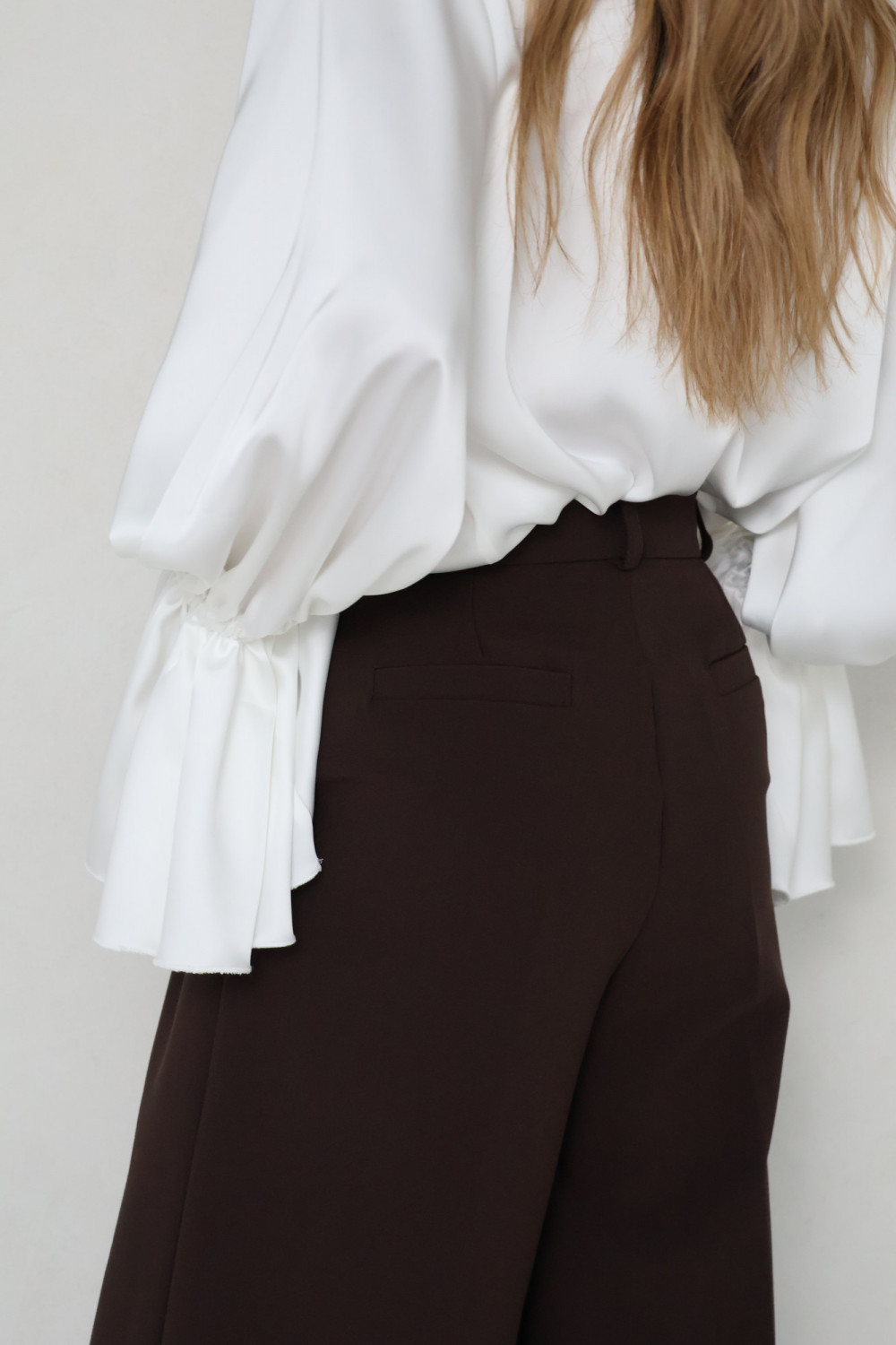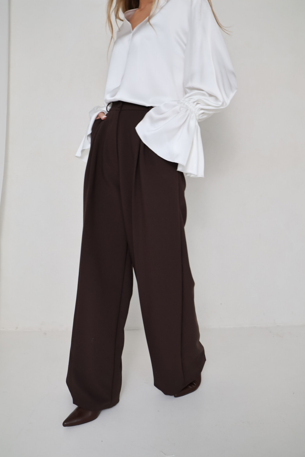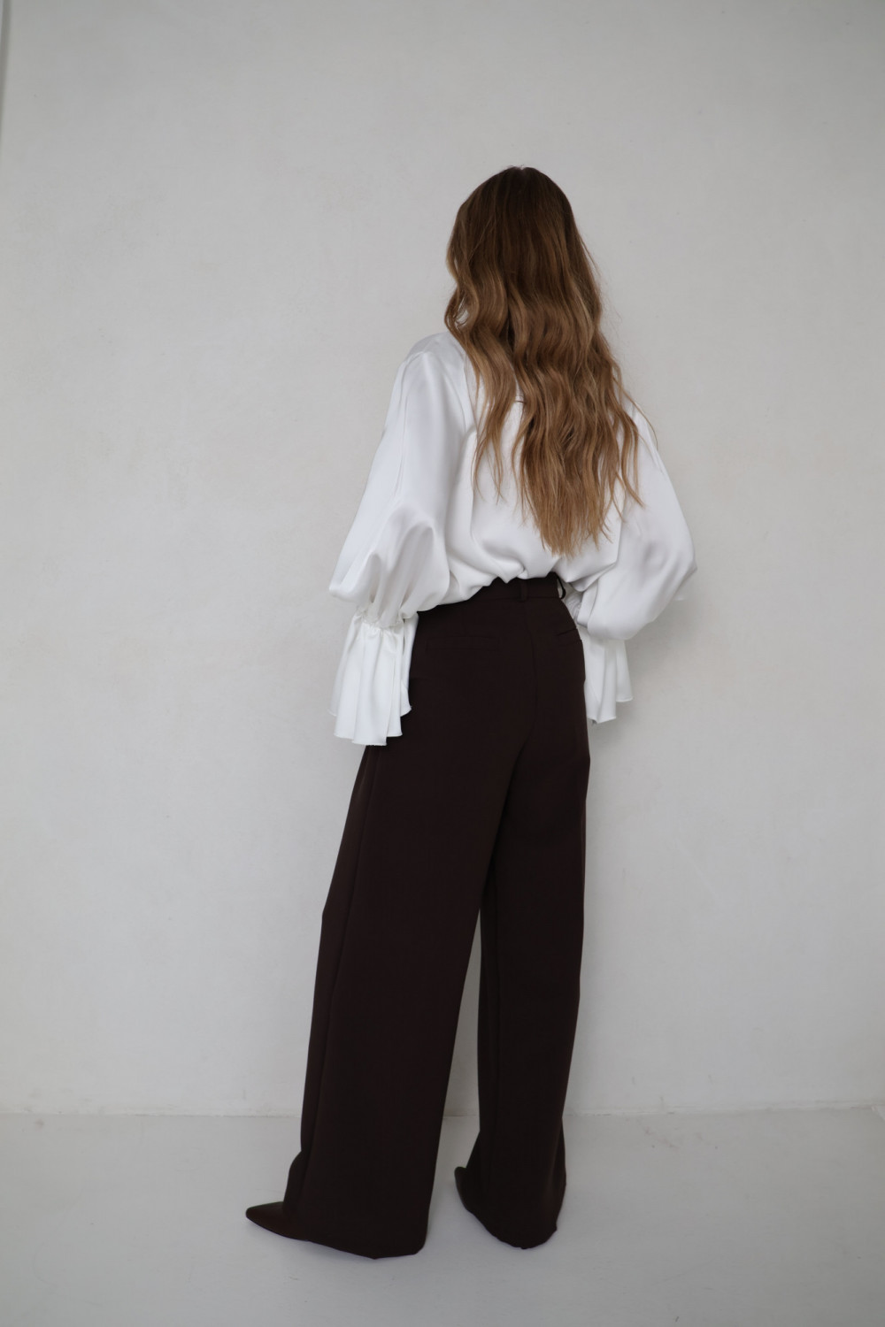 Spodnie STREETSTYLE w czekoladowym kolorze wykonane są z wysokiej jakości materiału, który zapewnia komfort noszenia przez cały dzień. Wysoki stan podkreśla talię, a rozszerzane nogawki nadają sylwetce lekkości i optycznie wydłużają nogi.