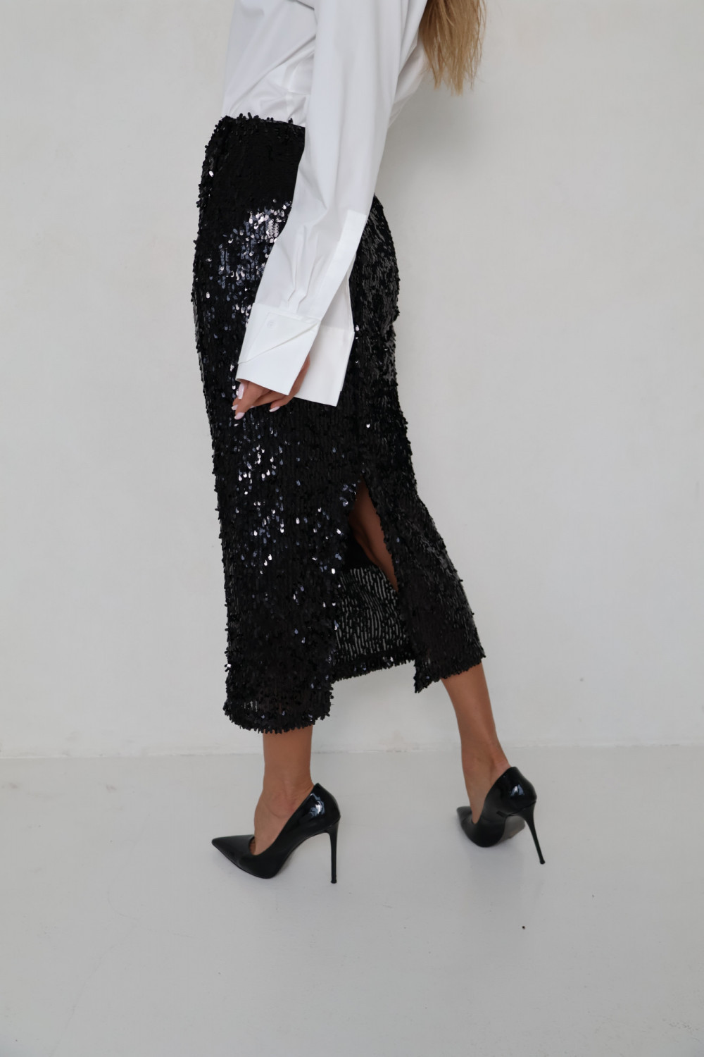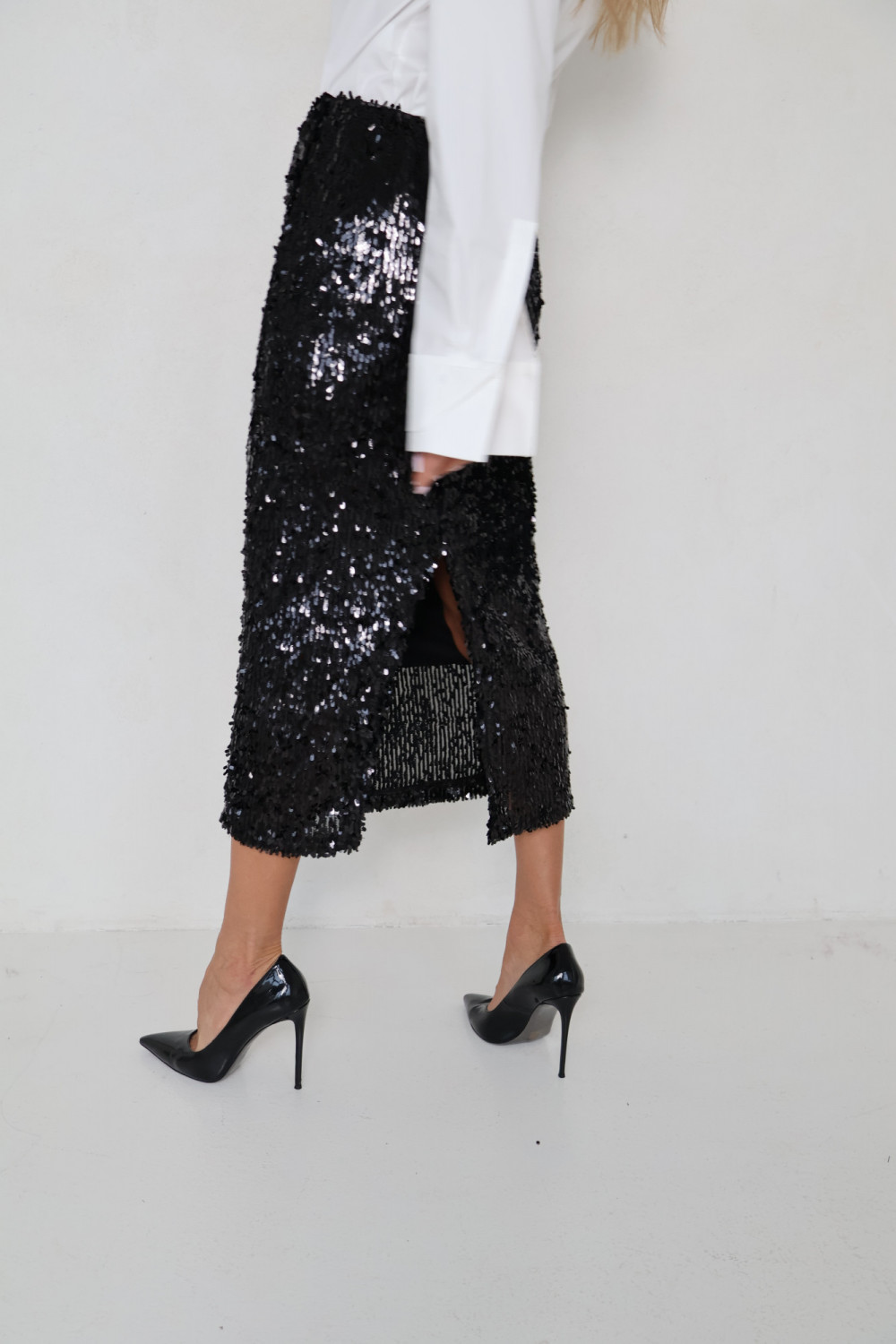 Spódnica HALLIE w czarnym kolorze wykonana jest z lekkiego, cekinowego materiału, który pięknie odbija światło i nadaje sylwetce efektowny blask. Elastyczny pas zapewnia wygodę noszenia i pozwala na dopasowanie spódnicy do sylwetki, podkreślając talię.