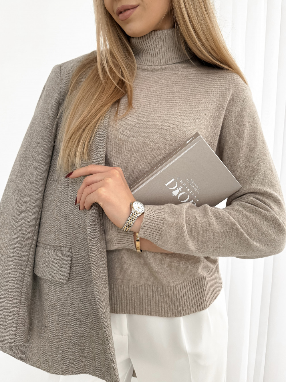 Golf VEIL w odcieniu beżowym to elegancki i komfortowy wybór na chłodne dni. Wykonany z wysokiej jakości mieszanki wełny i kaszmiru, zapewnia doskonałe ciepło oraz miękkość, co sprawia, że jest przyjemny w noszeniu. Klasyczny krój idealnie otula szyję, a neutralny kolor beżowy dodaje stylu i uniwersalności, świetnie komponując się z różnorodnymi stylizacjami. Golf VEIL doskonale sprawdzi się zarówno w codziennych, jak i bardziej formalnych outfitach, wprowadzając do każdej stylizacji nutę luksusu i wygody. To niezbędny element w każdej garderobie, łączący modny design z funkcjonalnością.