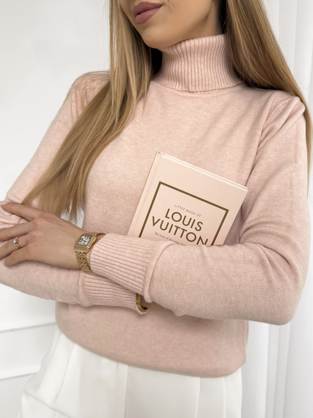 Minimalistyczny design i gładka struktura sprawiają, że golf Zen jest niezwykle uniwersalny – świetnie komponuje się zarówno z codziennymi stylizacjami, jak i eleganckimi zestawami na bardziej formalne okazje. Pudrowy róż to ciepły, ponadczasowy kolor, który wprowadza do garderoby subtelną świeżość i delikatność.