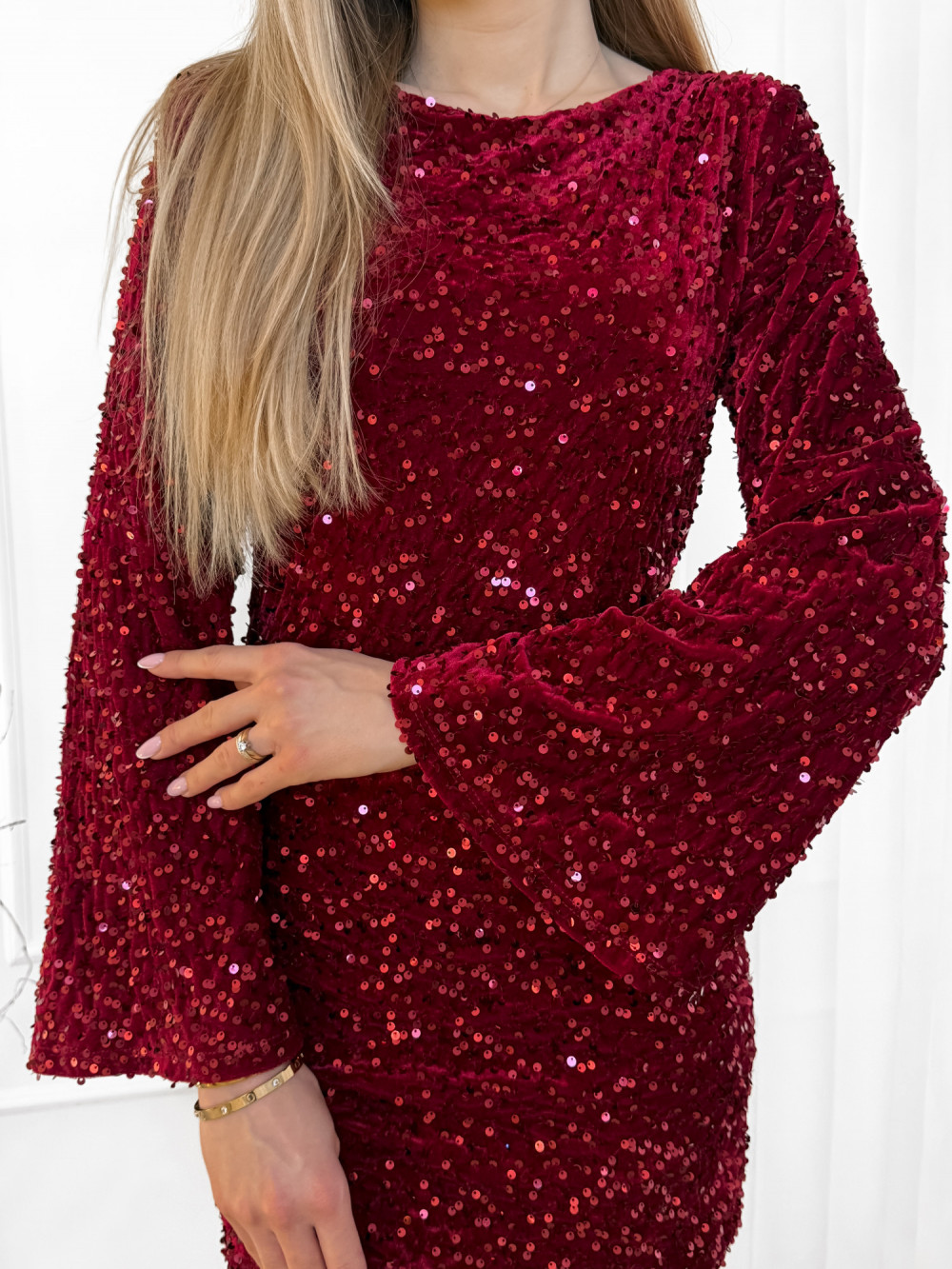 Krótki fason doskonale podkreśla sylwetkę, a rozszerzane rękawy wprowadzają lekkość i kobiecy akcent. Bordowy kolor sukienki w połączeniu z cekinami tworzy subtelną, ale odważną kompozycję, która z pewnością wyróżnia się na tle innych stylizacji.