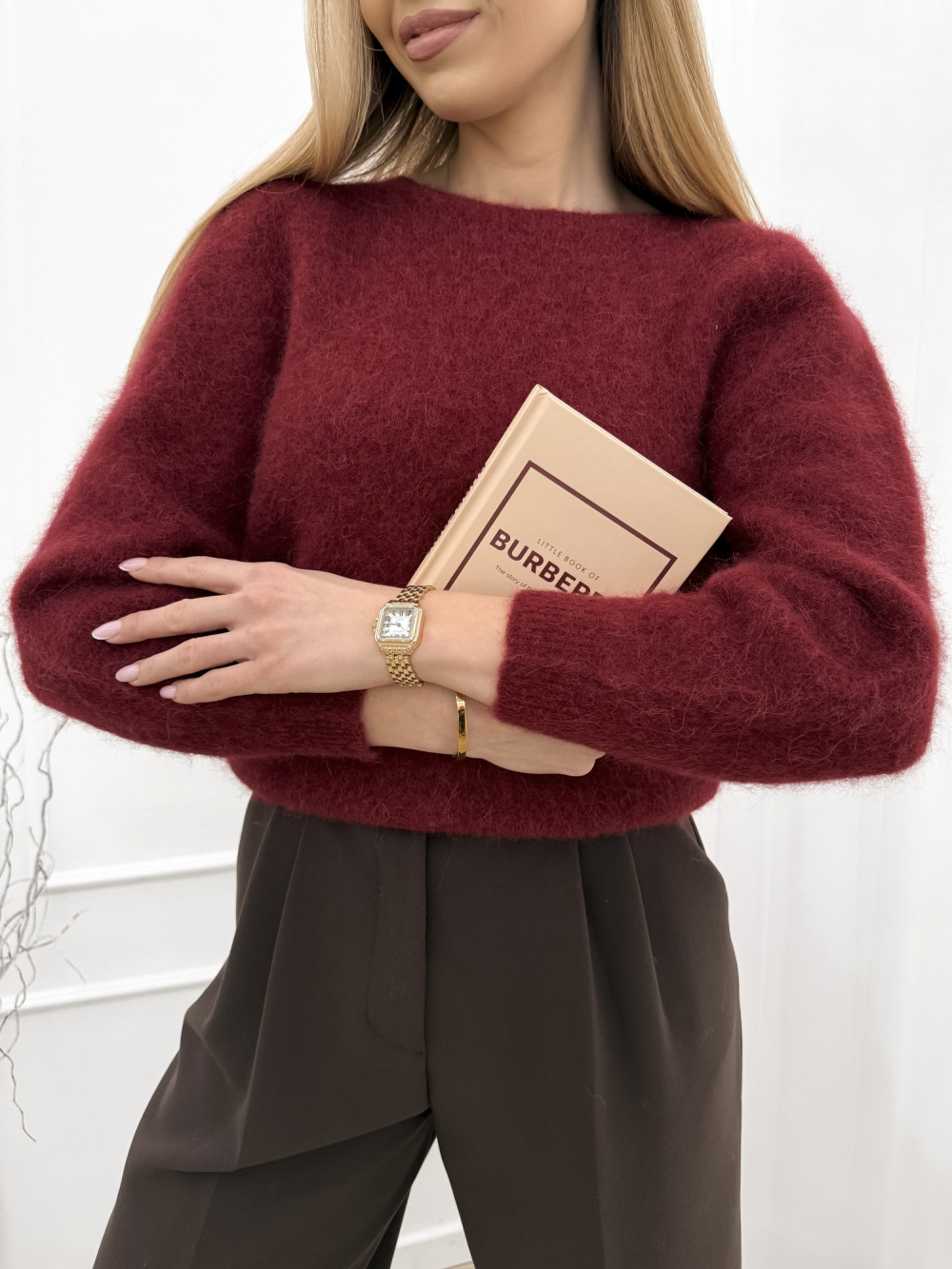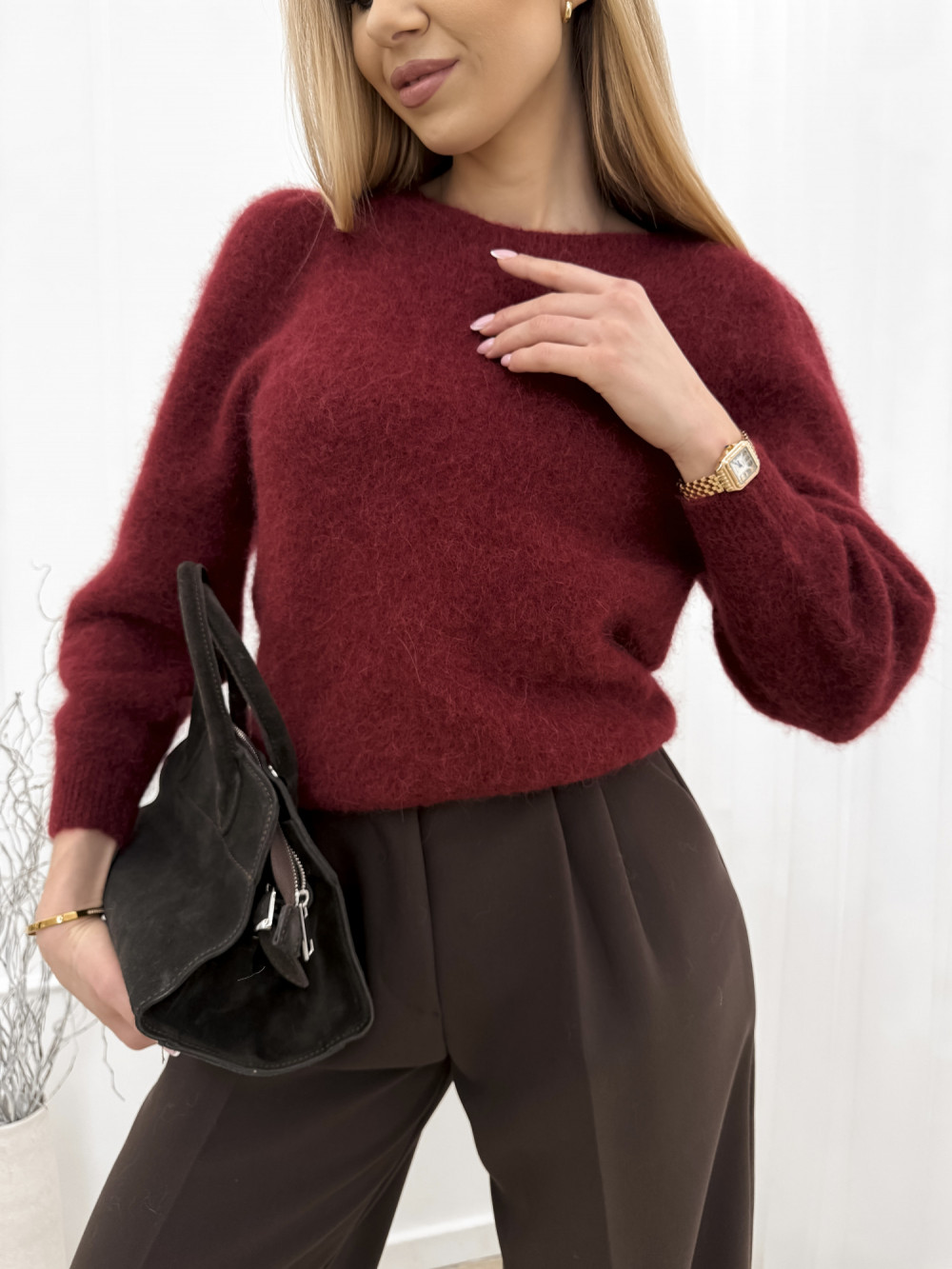 Cechą wyróżniającą ten model jest subtelne marszczenie na ramionach, które nadaje swetrowi unikalnego charakteru i podkreśla jego modowy akcent. Bordowy odcień dodaje swetrowi głębi i elegancji, doskonale wpisując się w jesienne i zimowe stylizacje.