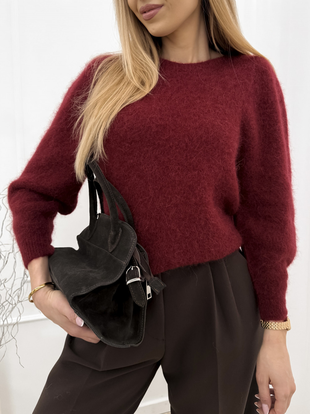 Sweter z alpaki i wełny dziewiczej z marszczeniem na ramionach bordo MALOMA