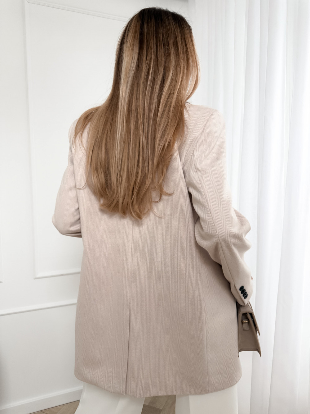 Design: Oversize’owy krój z precyzyjnie dopracowanymi detalami, który sprawia, że marynarka świetnie układa się na każdej sylwetce.