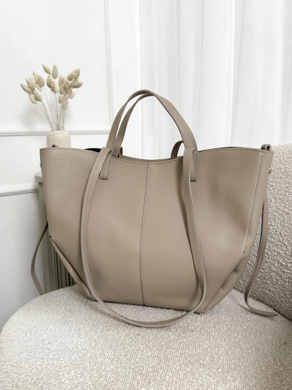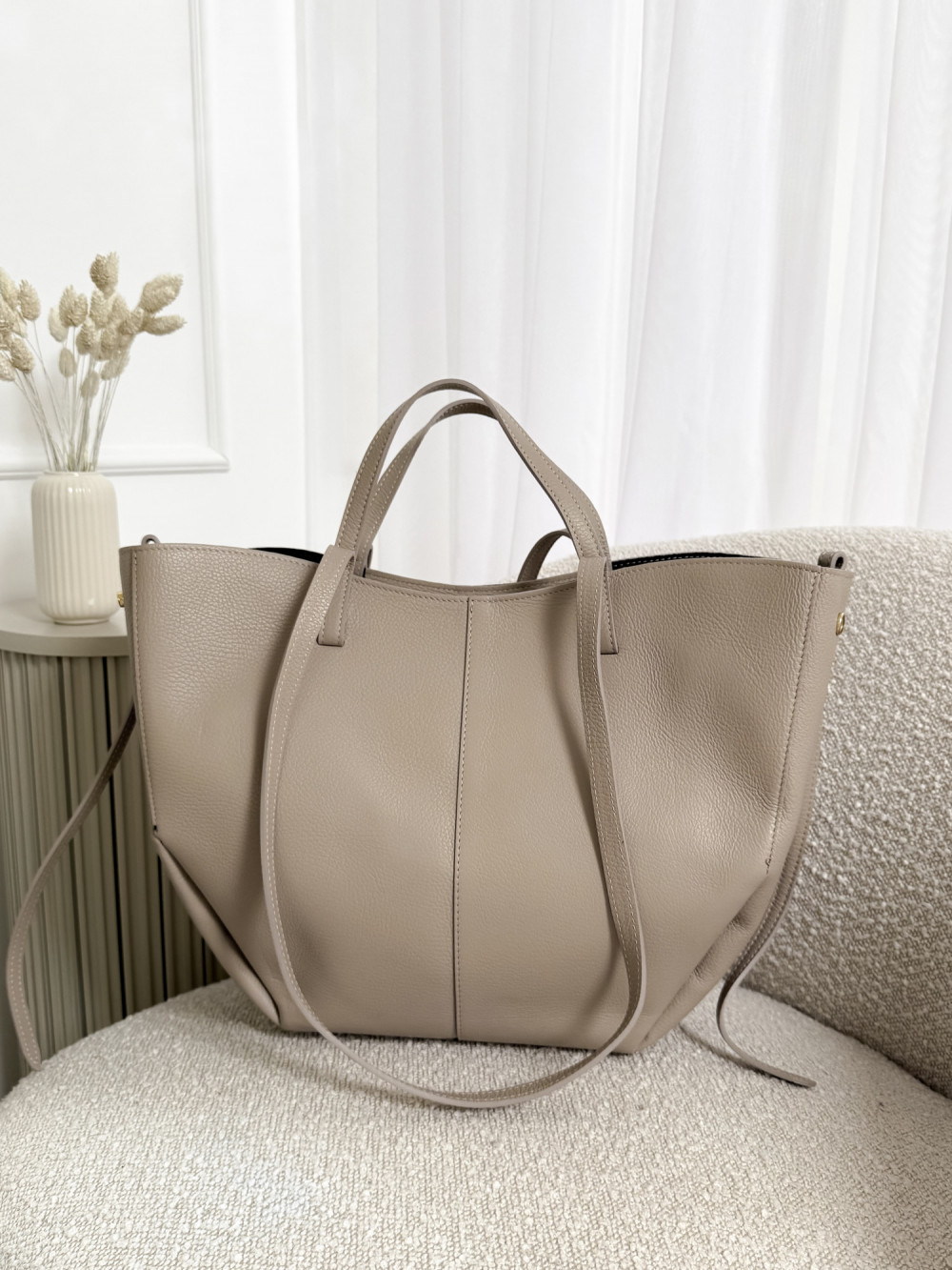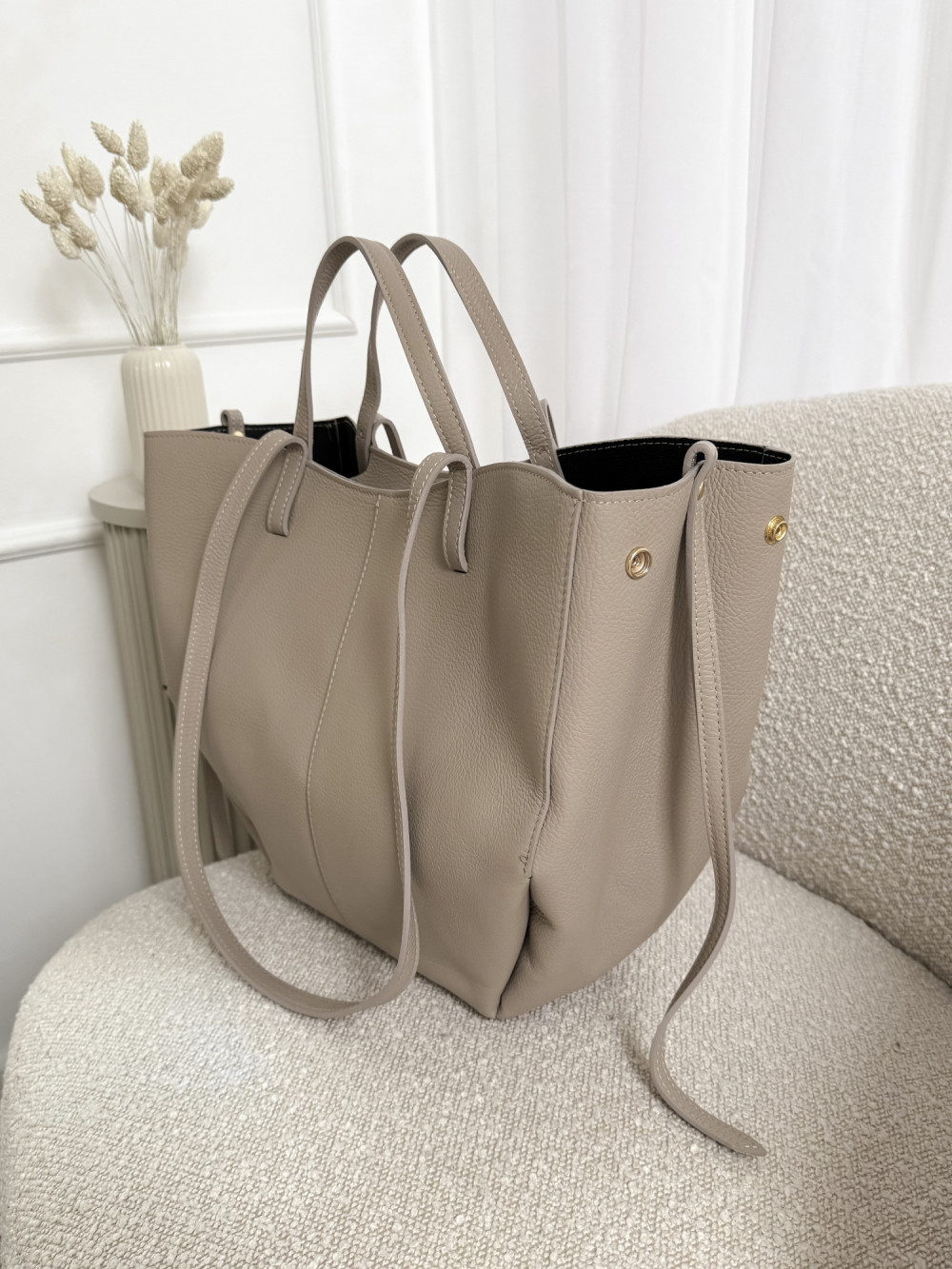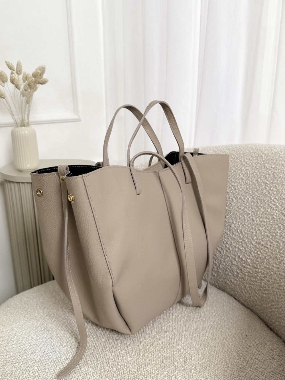 Torebka SOLENE MAXI w chłodnym odcieniu beżu to połączenie luksusu, funkcjonalności i nowoczesnej klasyki. Wykonana z najwyższej jakości skóry naturalnej, wyróżnia się subtelnym, chłodnym beżem, który dodaje jej elegancji i wyjątkowego charakteru. Duży rozmiar torebki sprawia, że jest doskonałym wyborem dla kobiet ceniących przestronność i wygodę – pomieści wszystkie codzienne niezbędniki, zachowując przy tym stylowy wygląd.
