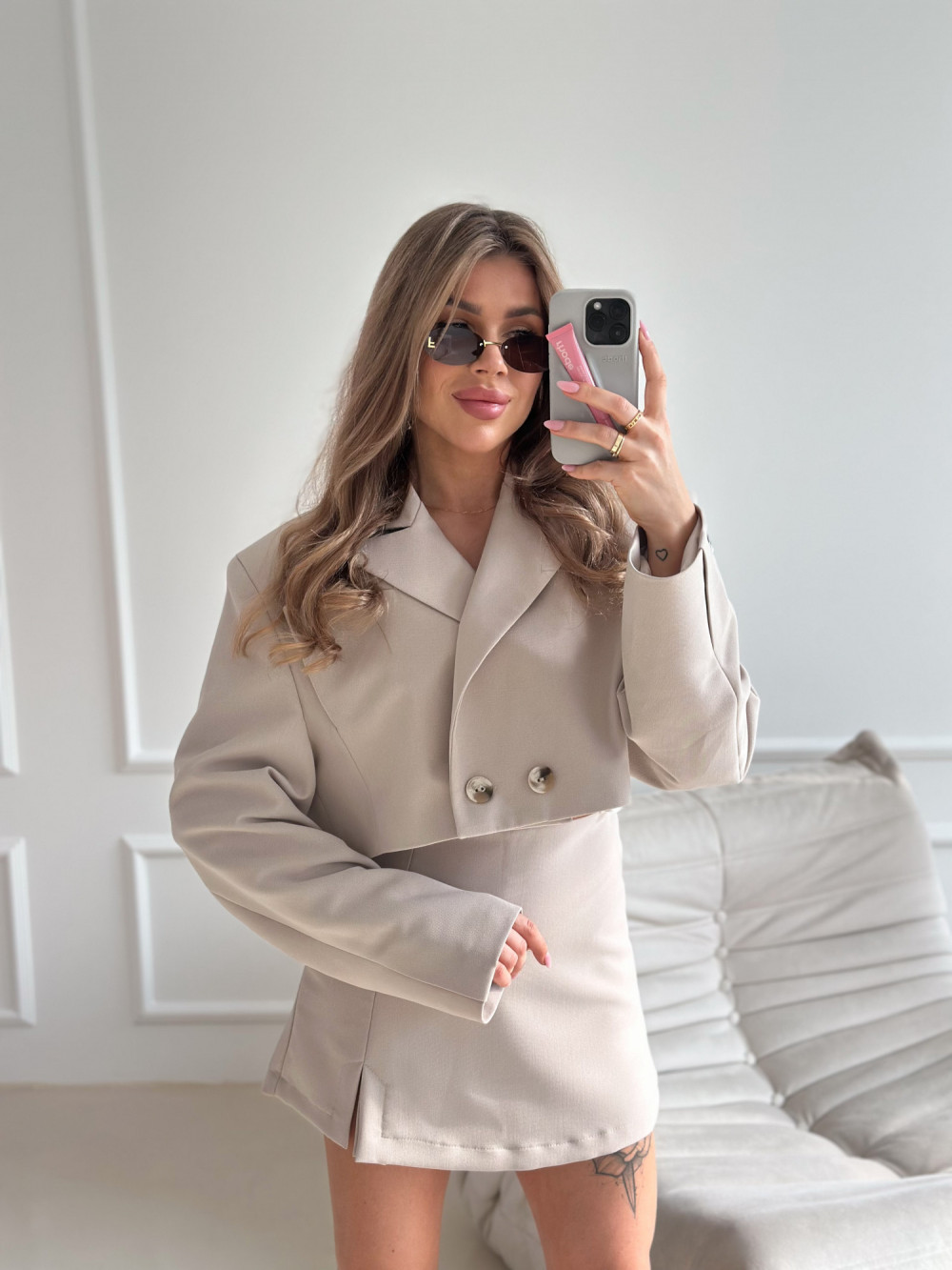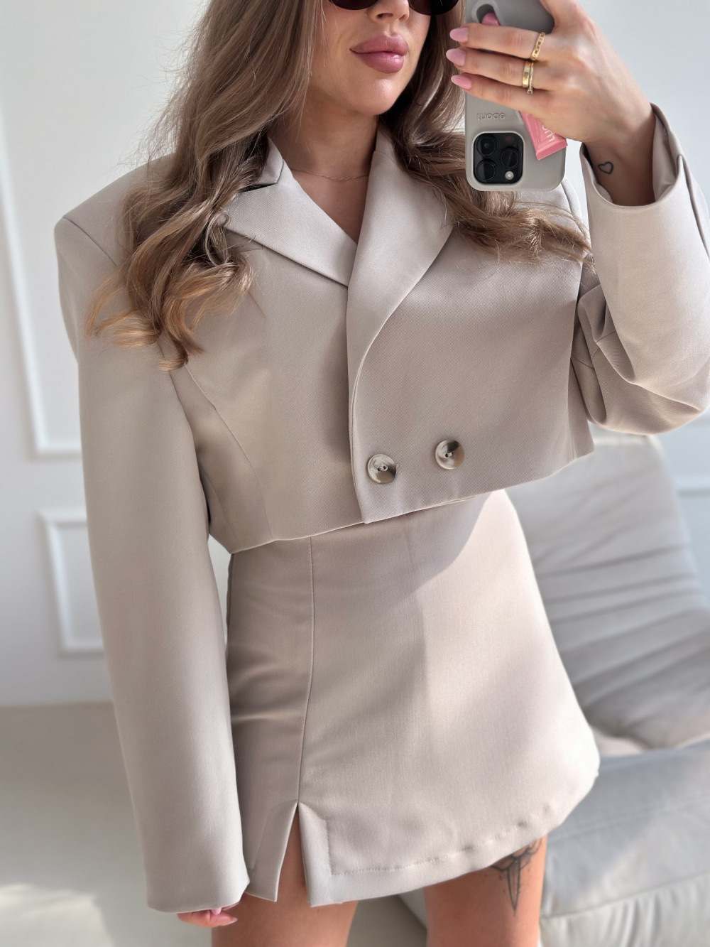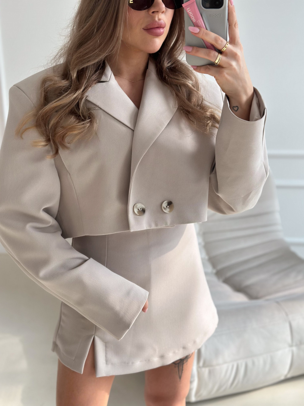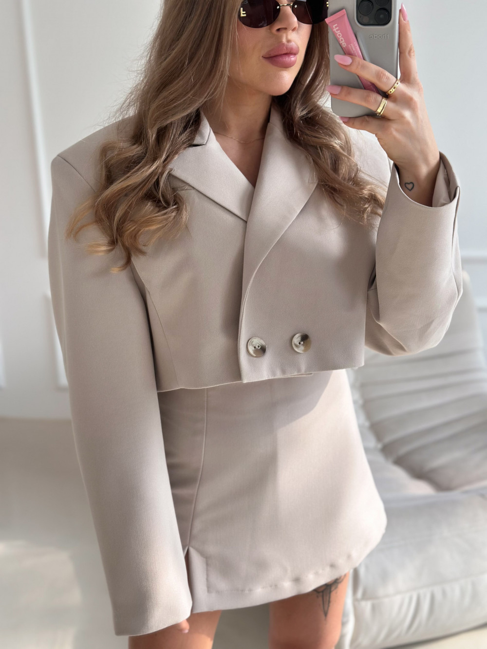Marynarka krótka beż ELITE to elegancka i ponadczasowa propozycja, która doskonale łączy klasyczny styl z nowoczesnym akcentem. Jej stonowany beżowy kolor nadaje całości subtelną elegancję, a krótki fason podkreśla talię, tworząc smukłą sylwetkę.