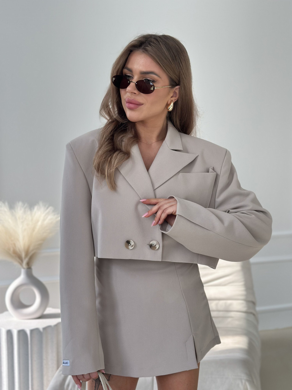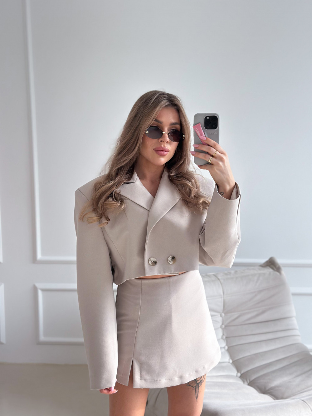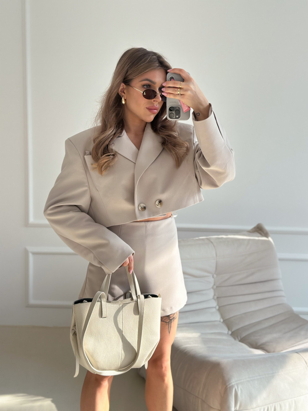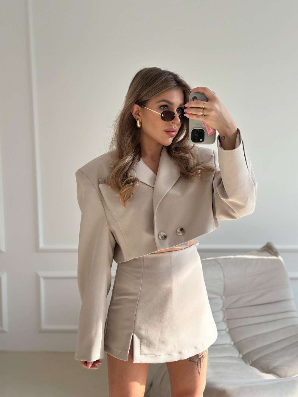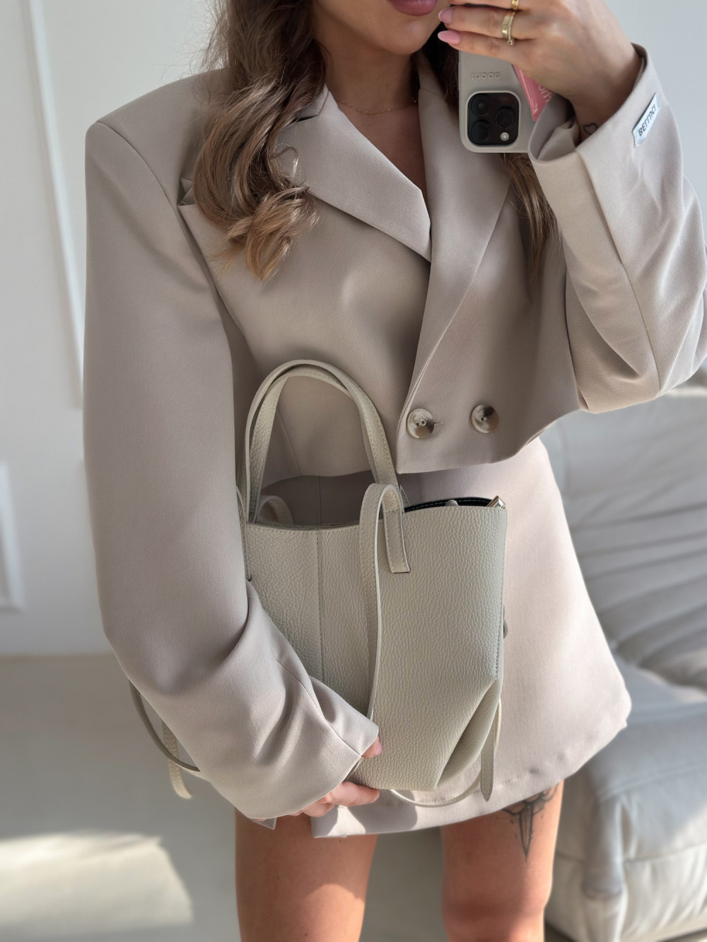 Marynarka krótka beż ELITE to elegancka i ponadczasowa propozycja, która doskonale łączy klasyczny styl z nowoczesnym akcentem. Jej stonowany beżowy kolor nadaje całości subtelną elegancję, a krótki fason podkreśla talię, tworząc smukłą sylwetkę.