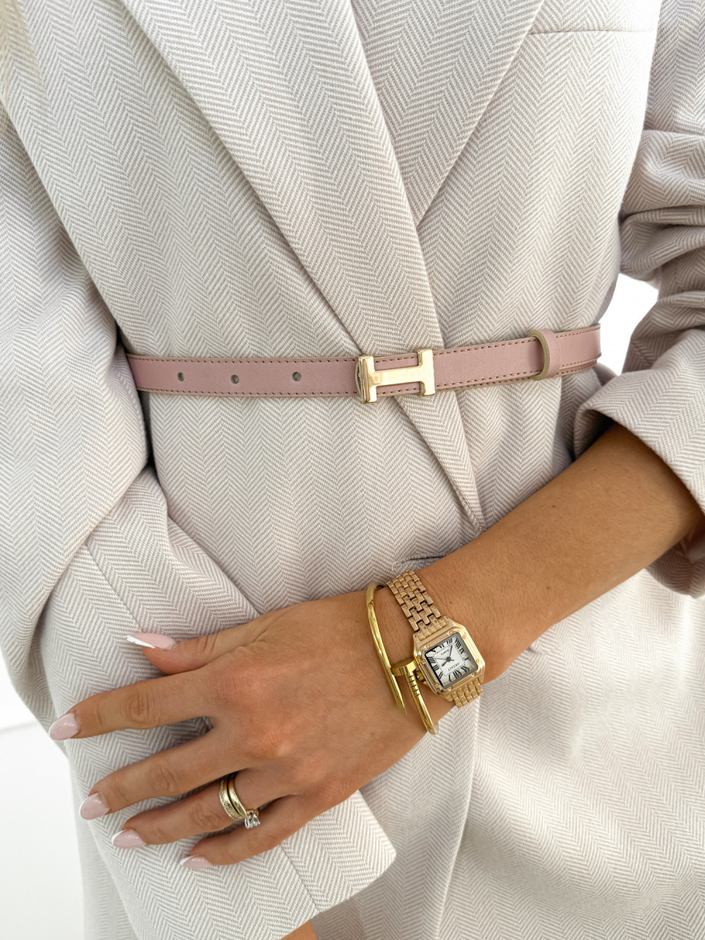 Pasek H 2 cm 100% skóra naturalna pudrowy róż CLOU to elegancki dodatek, który doda klasy każdej stylizacji. Wykonany w całości z naturalnej skóry, zapewnia trwałość i wyjątkową jakość, a jego delikatny pudrowy róż wprowadza subtelną świeżość i elegancję. Klamra w kształcie litery H nadaje mu nowoczesnego charakteru, doskonale komponując się z minimalistycznymi, jak i bardziej wyszukanymi outfitami. Pasek CLOU to doskonały wybór, który łączy funkcjonalność z ponadczasowym stylem, idealny do codziennych oraz eleganckich stylizacji.